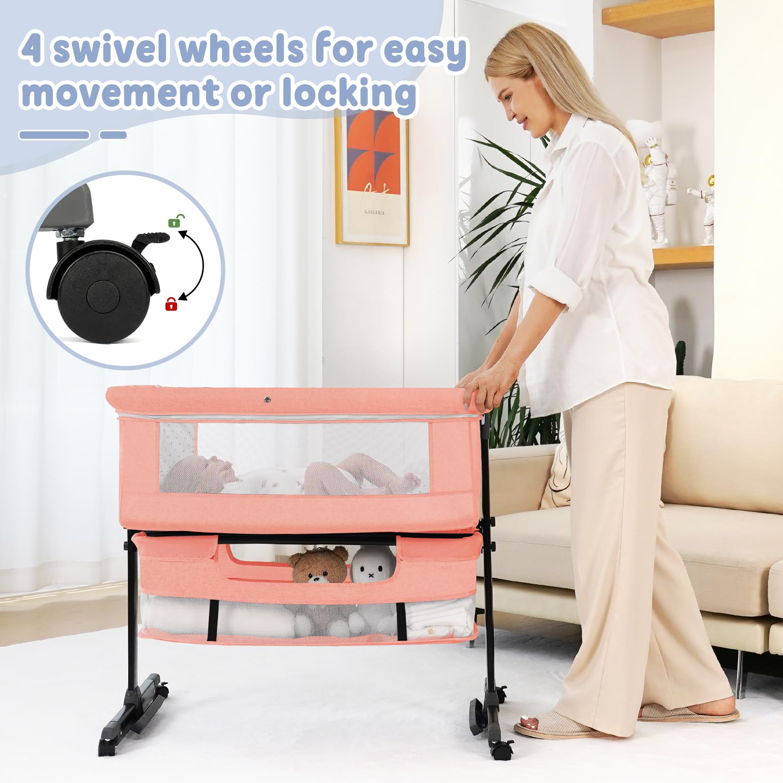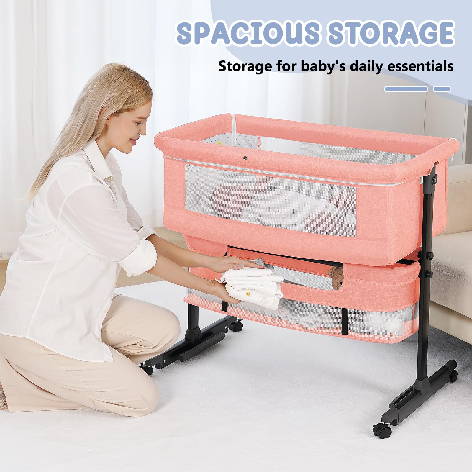 Convenient Storage and Mobility: Our Baby Bassinet comes equipped with a storage basket, providing a convenient space to keep essential items such as diapers, wipes, or toys within reach. Additionally, it features wheels that allow for easy mobility, making it effortless to move the bassinet from room to room.