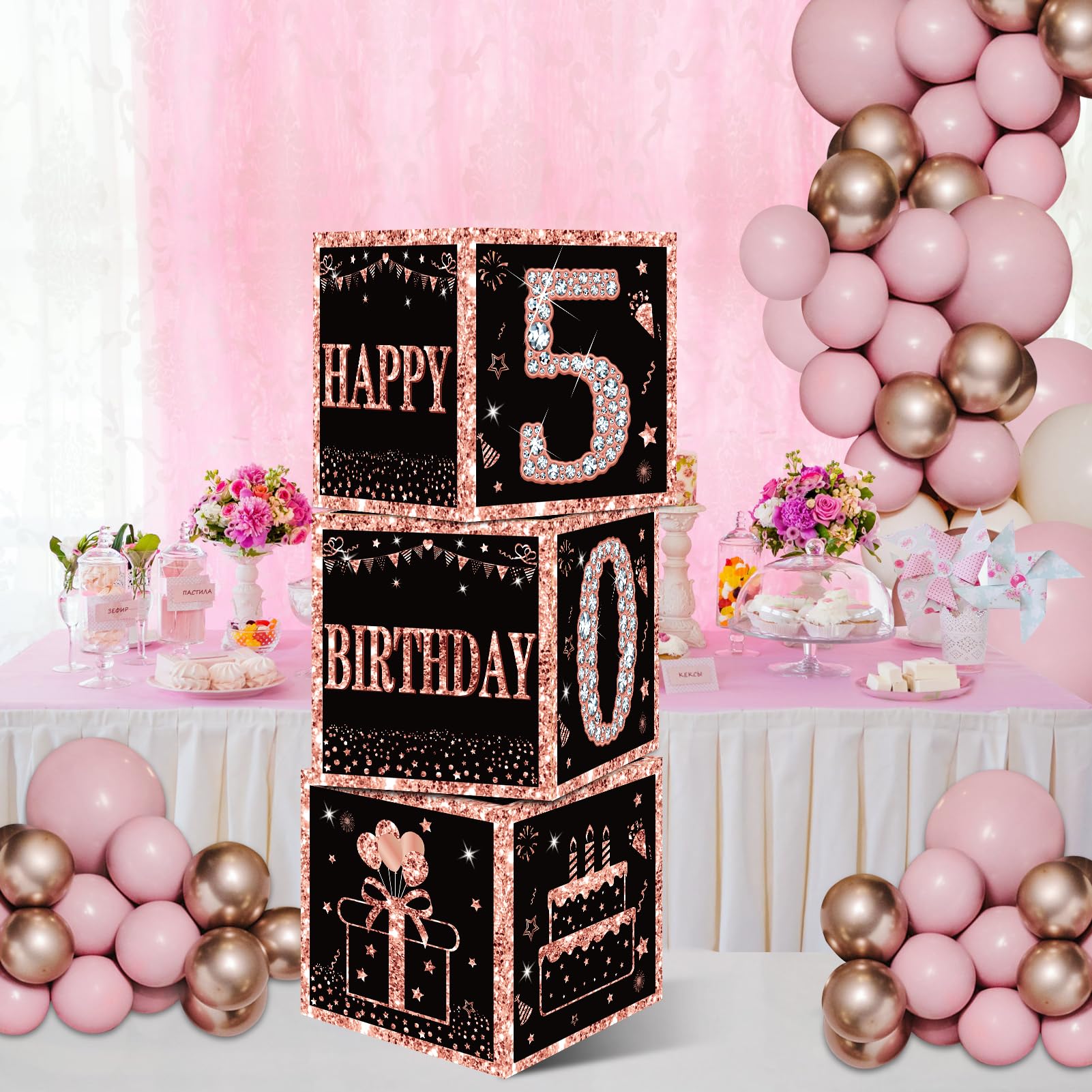 [You Will Receive] -3pcs rose gold 50th birthday balloon boxes decorations, the size of each box is 10.62×10.62×10.62inch. This set of great 50th birthday party display decorations. (Note: This set of decorations does not include balloons).