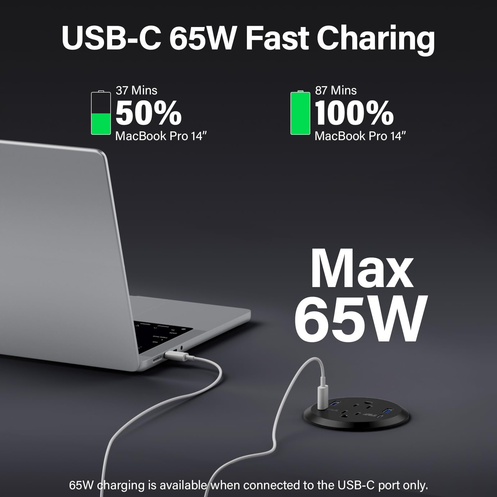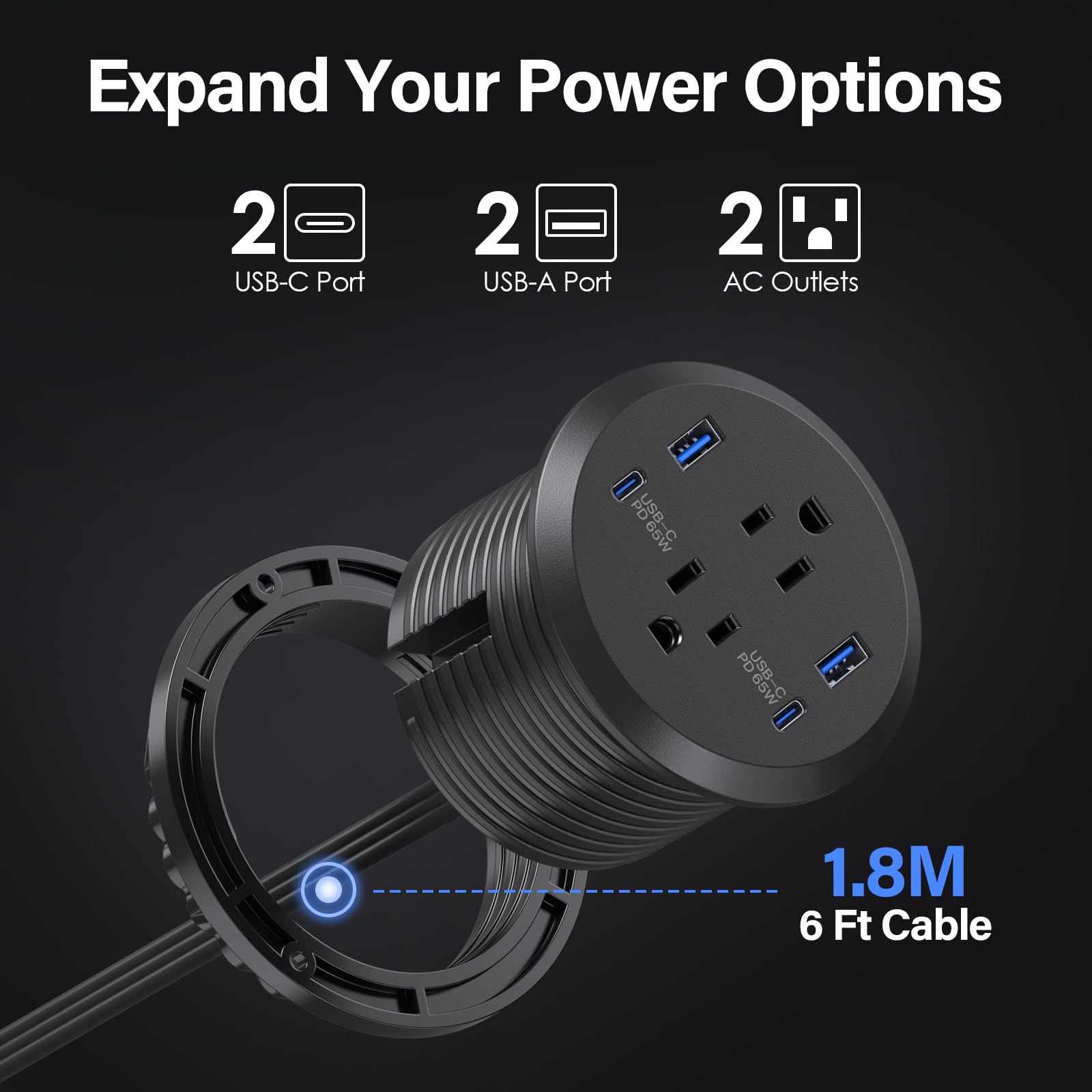 Rapid Power Delivery: Our PD 65W USB C desk power grommet outlet is engineered for efficiency. It supports advanced USB PD 3.0, QC3.0, and PPS technologies to fast charge your devices. Utilize the mix of 2 USB-C and 2 USB-A ports to simultaneously power up your phone, laptop, smartwatch, and earbuds.