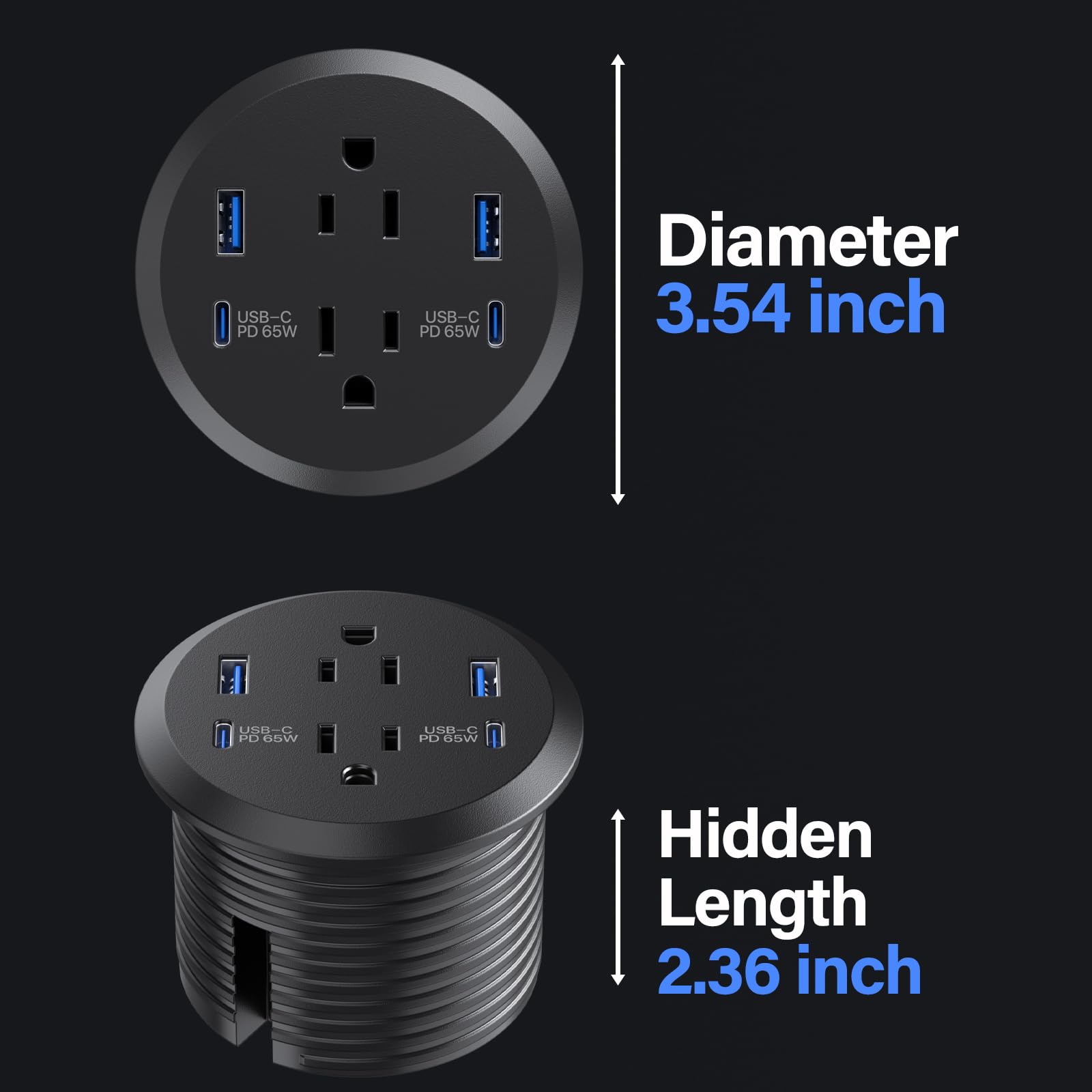 Streamline Your Workspace: Experience the sleek, minimalist design of our surface mount recessed power grommet. Say goodbye to bulky adapters with this 3-inch desk hole grommet, featuring 2 power outlets and 4 USB ports perched atop your desktop outlet for a nearly flush, clutter-free surface.
