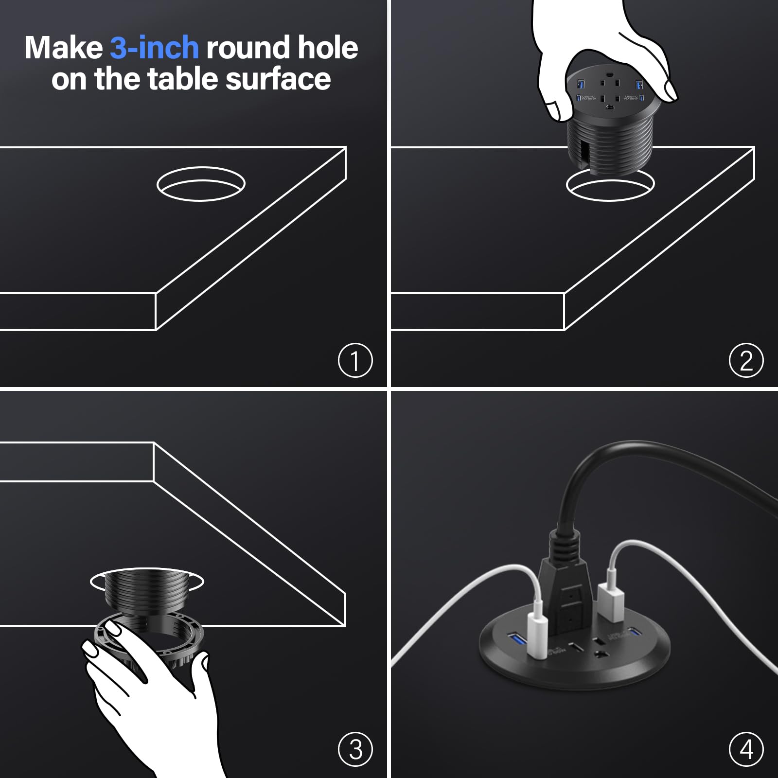 Installation Made Simple: Designed to fit a 3-inch grommet hole, this desktop power grommet can be easily inserted into your existing desk cable aperture or a new opening, transforming your workspace into an organized charging haven with minimal effort.