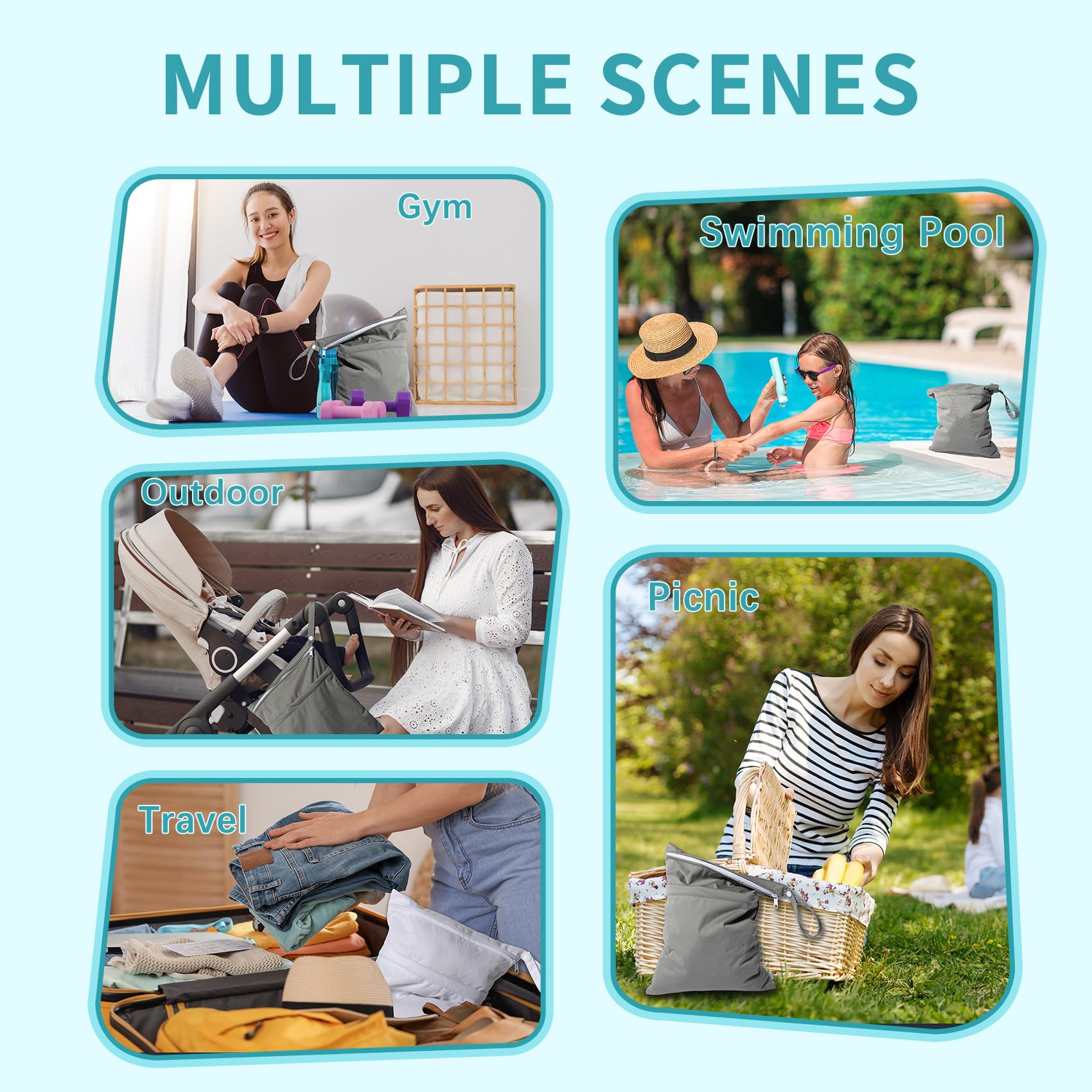 Double-Pocket Design with Snap Handle: Each wet bag contains two pockets, which comes with two zip closures to ensure that nothing will drop out of the bag and better to keep the clean and dirty items separately. With the snap handle design, you can unbutton the haddle and easily hang the bag on the stroller or door knobs, towel rod ect. anywhere you want.