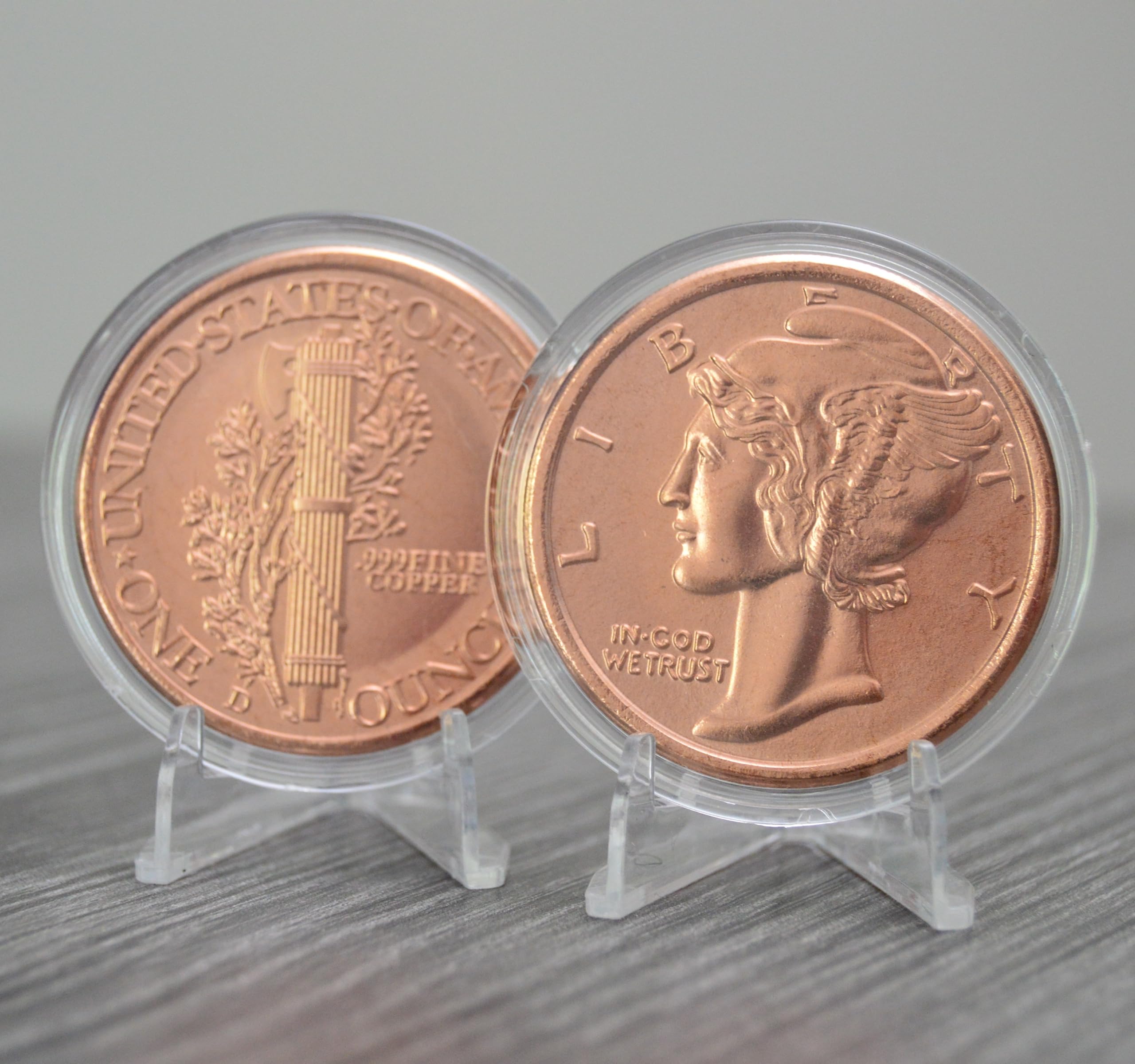 Presenting the Mercury Dime Replica 1 oz Pure .999 Copper Round, a stunning homage to a key piece of American numismatic history. Crafted in the USA from high-quality, pure .999 copper, this bullion coin makes a prized addition to any copper collector's or investor's assortment. The obverse of the round echoes the iconic Mercury Dime design, originally minted from 1916 to 1945. Displaying a profile of Liberty with a winged cap, often mistaken for the Roman god Mercury, this design is a cherished piece of American coinage due to its elegance and timeless appeal. Made from 99.9% pure copper, this bullion coin encapsulates authenticity and long-term value. The 1 oz weight provides a substantial copper piece that appeals to those seeking genuine and valuable additions to their collections or investments. Its weight is a tangible reflection of the value it holds. More than just an investment opportunity, the Mercury Dime 1 oz Pure .999 Copper Round is a coveted collector's piece. Its 39mm diameter allows the intricate details of the original Mercury Dime to stand out, displaying the exquisite artistry and craftsmanship. The smooth edges and glossy surface heighten its visual appeal, making it a compelling piece for display or collection. For long-lasting preservation, each coin is securely encapsulated in a protective capsule, safeguarding it from potential damage and maintaining its beauty for years to come. The coin is accompanied by a Certificate of Authenticity (COA) from Heavenly Metals, ensuring its .999 copper purity and origin, boosting confidence in the authenticity and value of the investment. Invest in the Mercury Dime Replica 1 oz Pure .999 Copper Round Bullion Coin today and own a piece of American numismatic history. It's more than just a round – it's a bridge to the past.