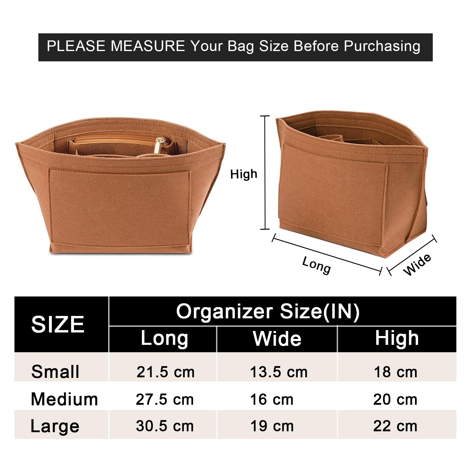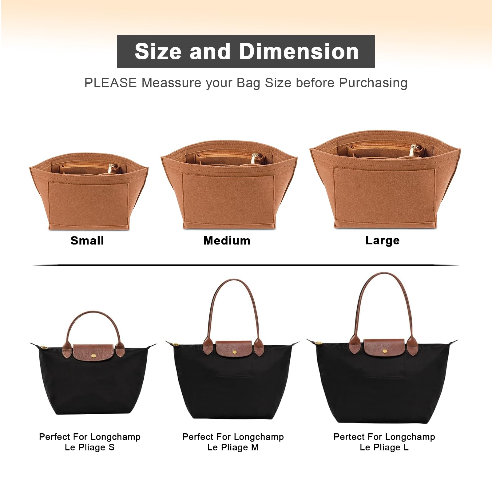 Size of the felt purse organizer insert - Medium: 10.8" (L)*5.9" (W)*7.9" (H) , suitable for Medium Size of long handle of Le pliage handbag, or similar size Tote Handbag,It will be more suitable if it is LESS than 0.5-1 inches to ensure a perfect fit,Please comfirm your bag size before purchasing again, thanks.