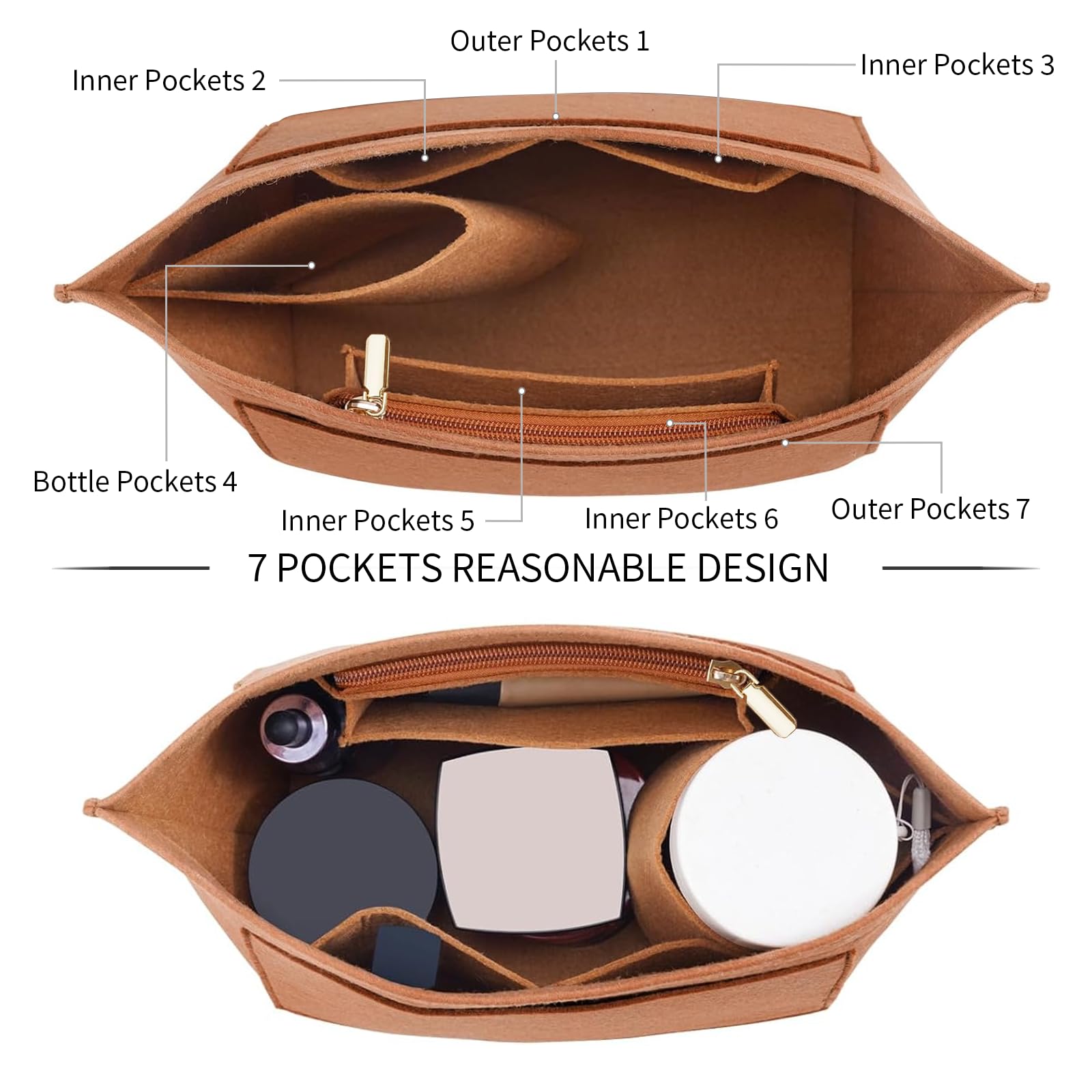 HIGH CAPACITY-MULTI-COMPARTMENTS: Featuring 7 compartments,Two of the pockets, which are exterior pockets, are for storing large items,Five pockets remain, one cup pocket opening and one zippered pocket(Made with high quality metal zipper head for long lasting use)You could store your mobile phone, wallet, cosmetics, glasses and other personal items in purse organizer insert, which is easy to switch bags throughout the day without having to reorganize.