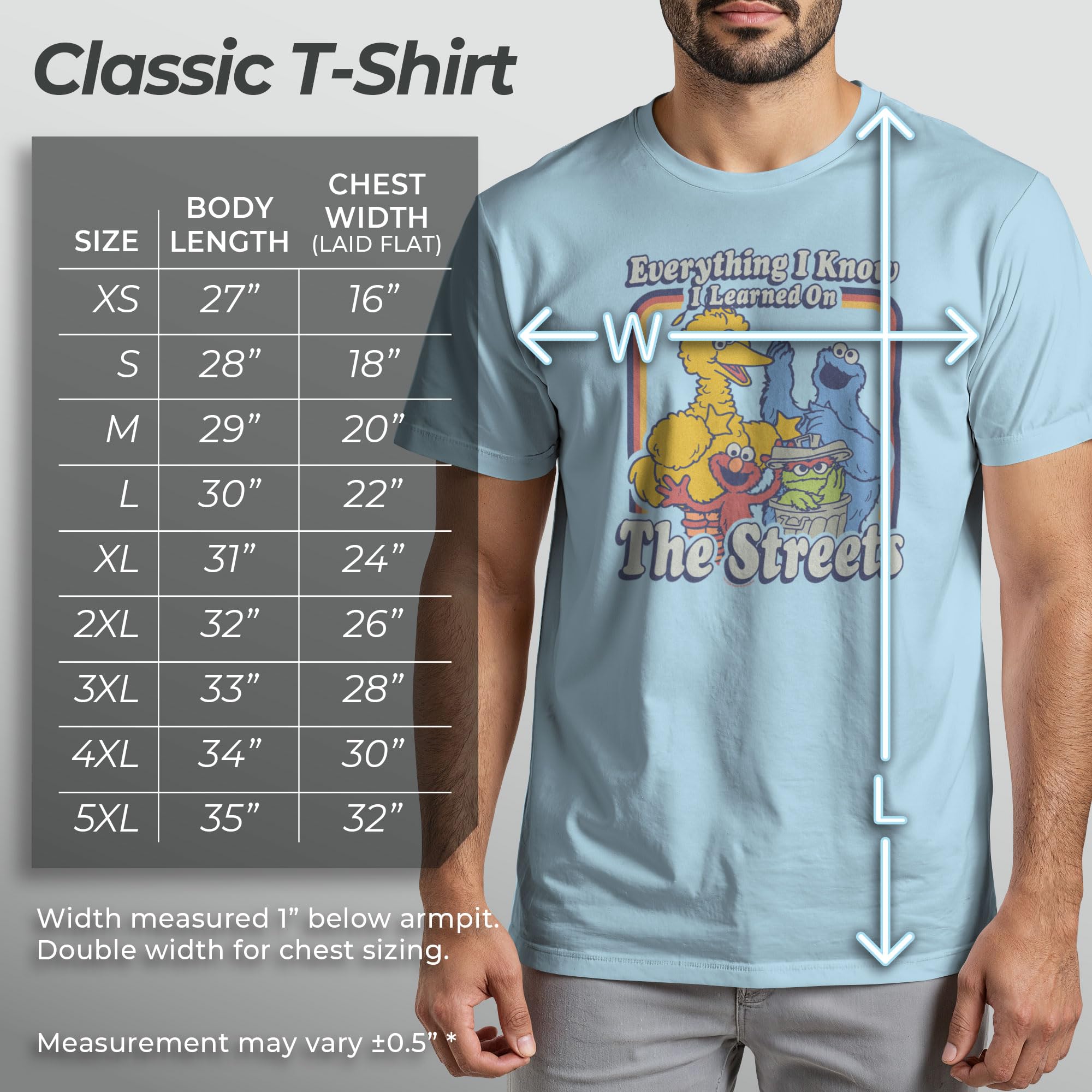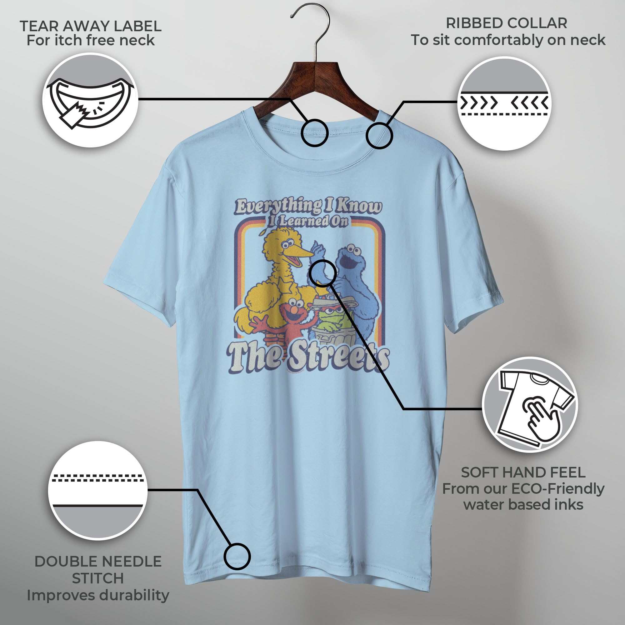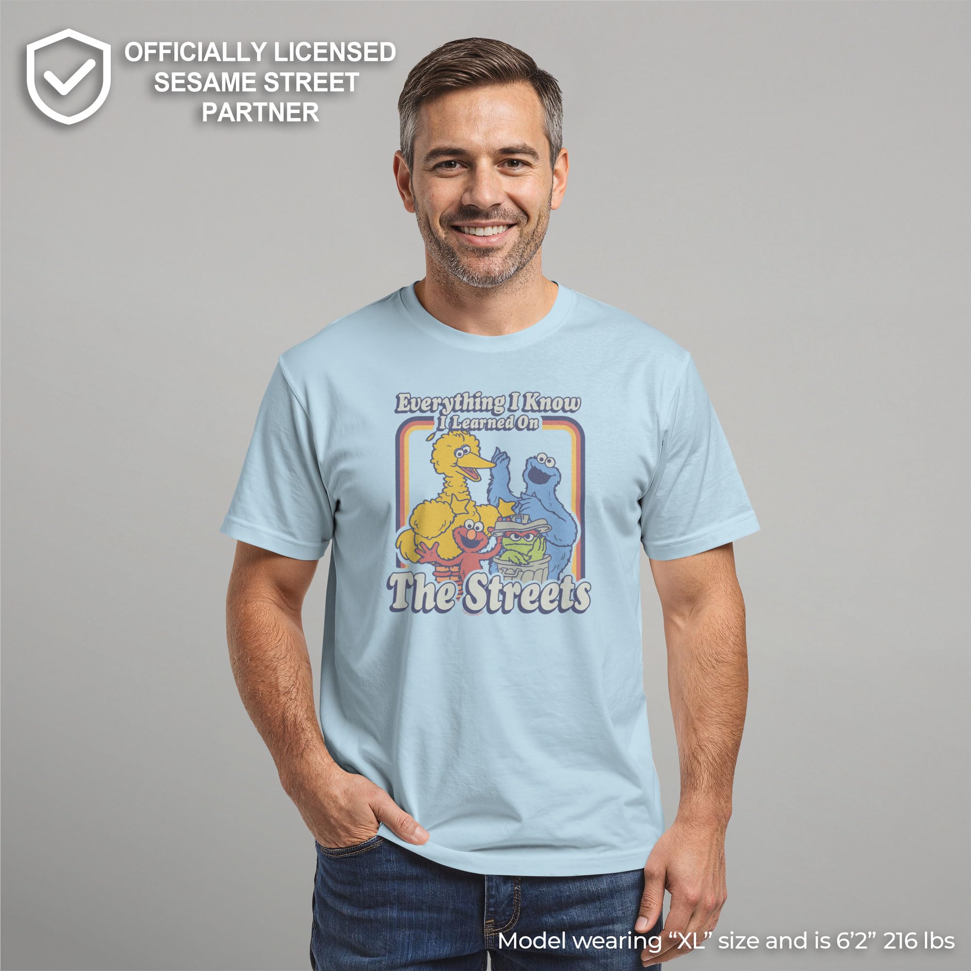 Men's Sesame Street T-Shirt "Everything I Know I Learned on The Streets" Short Sleeve Crew design.