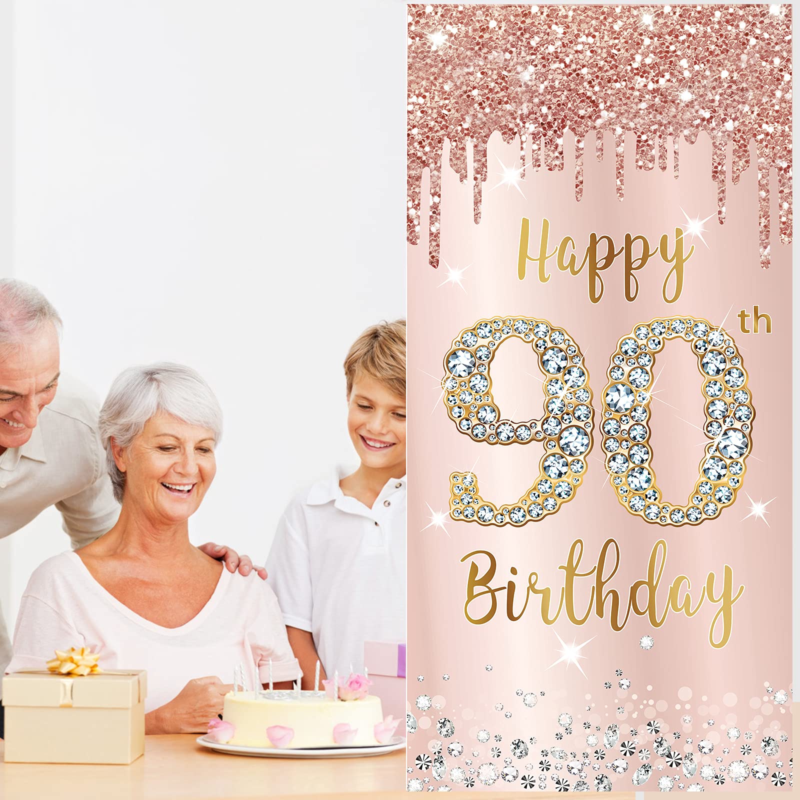 [You will get] - Pink rose gold 90th birthday happy birthday door banner party decoration, 72.8 X 35.4 inches, enough for you to decorate your birthday party and add a happy atmosphere to your birthday party.