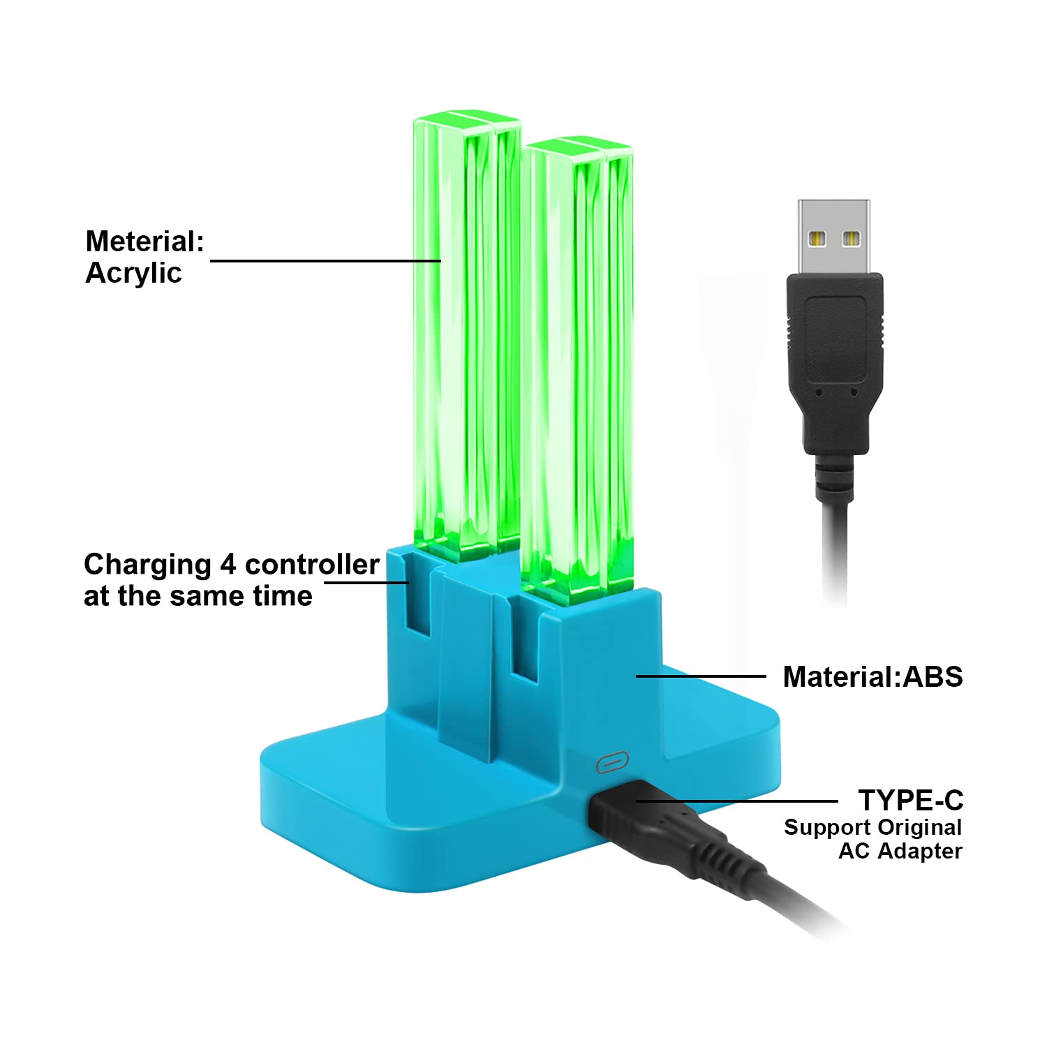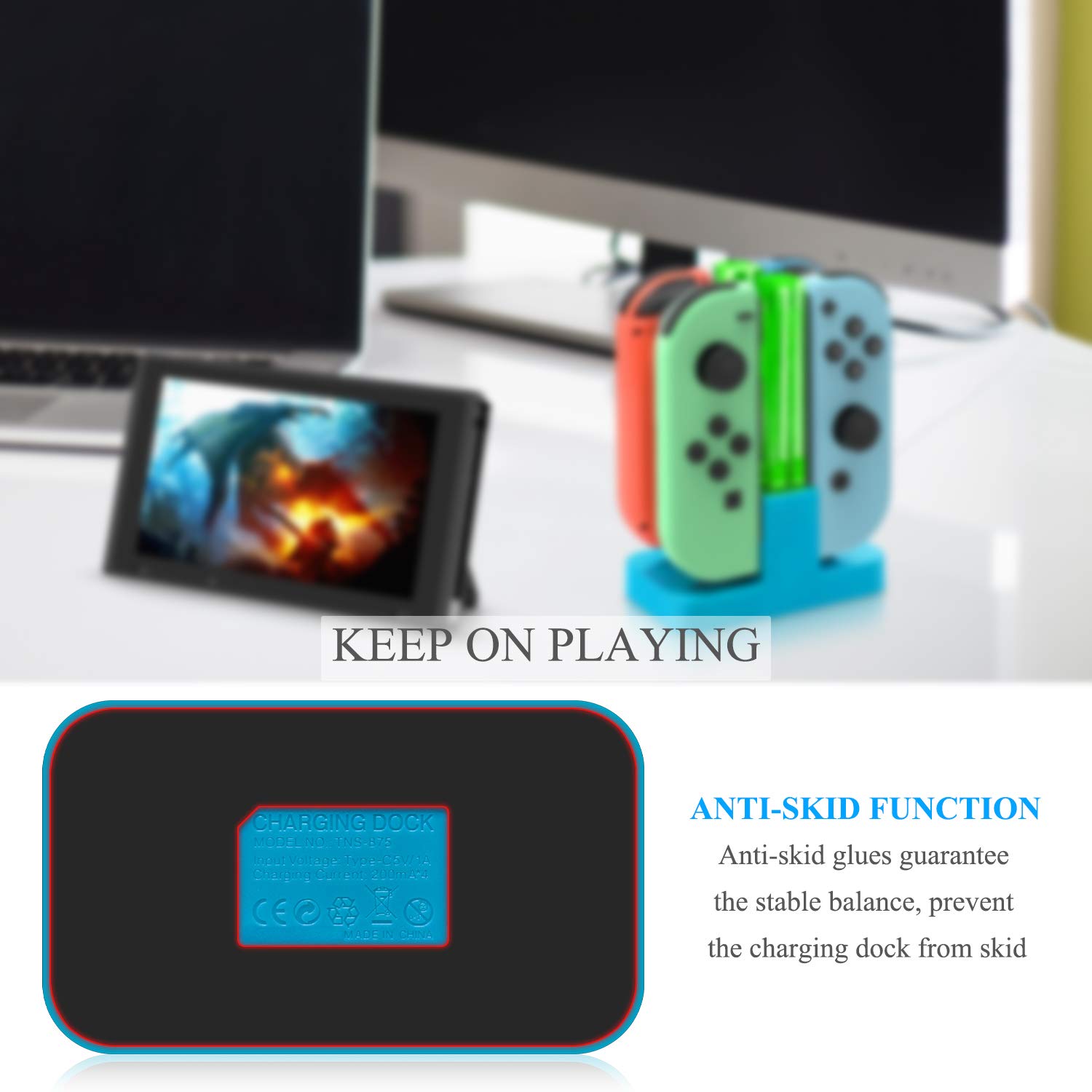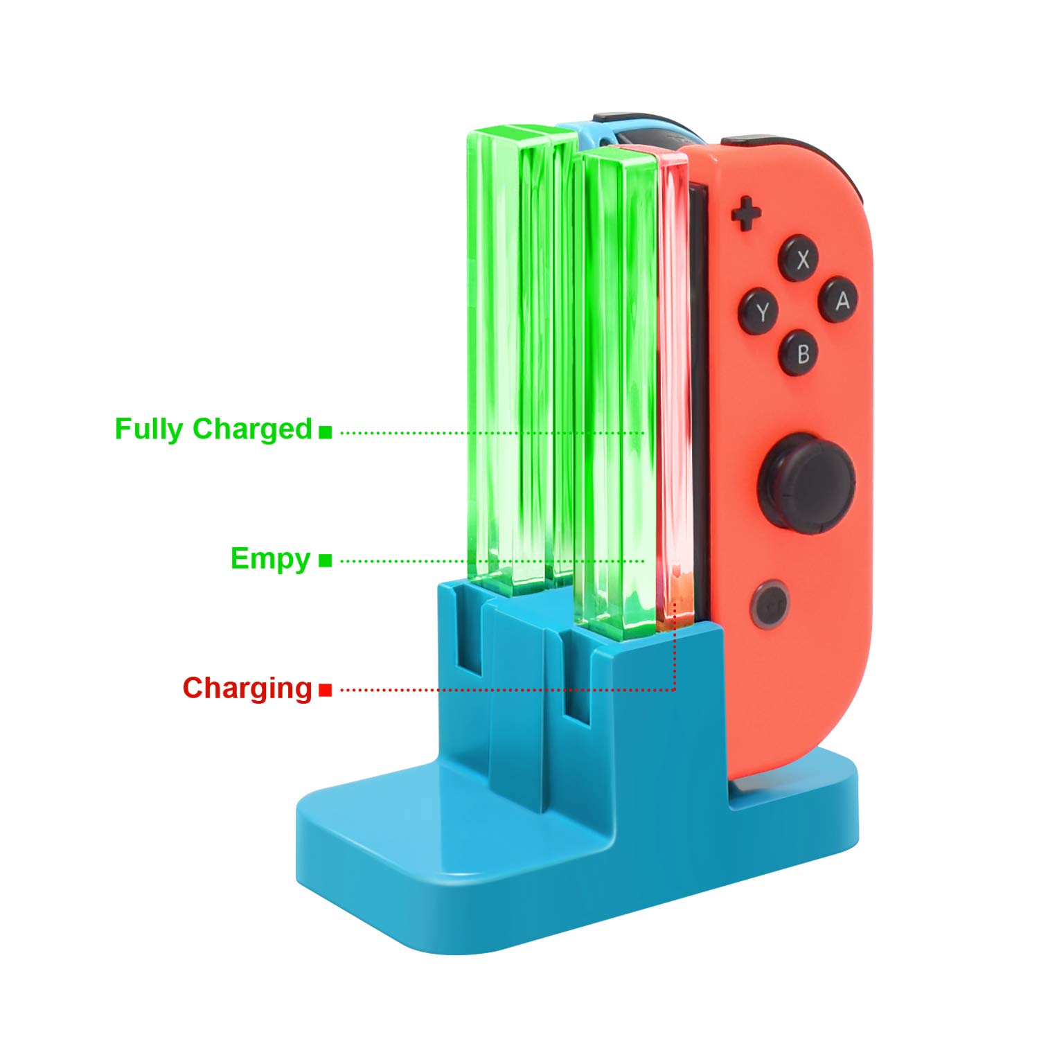 SIMPLE OPERATION DESIGN - Easy slide-in design & plug and play. Put for JoyCons into the charging dock, and plug it into any USB port, then it will charge. The individual LED lampposts will indicate charge level for JoyCon. So convenient.