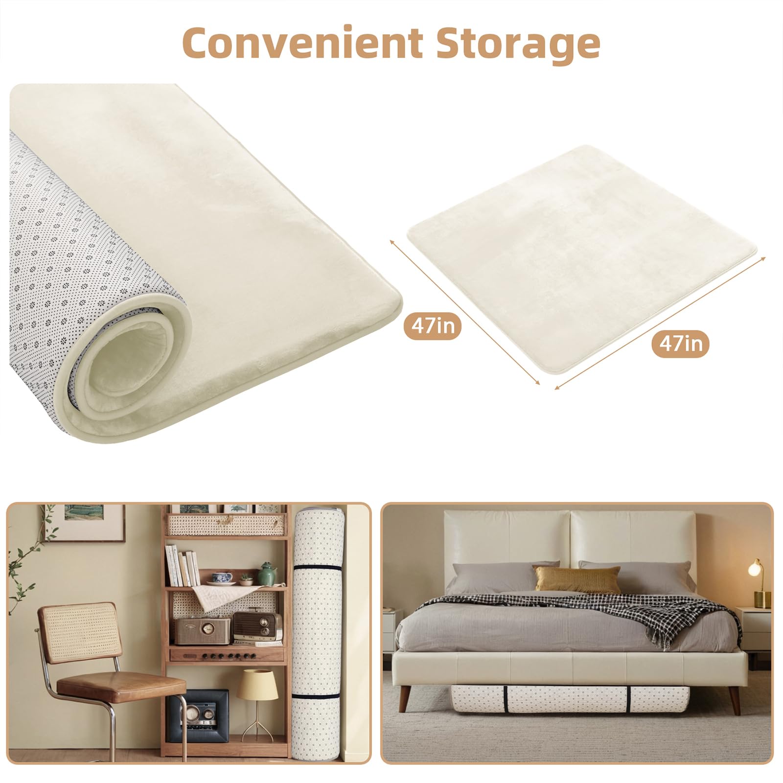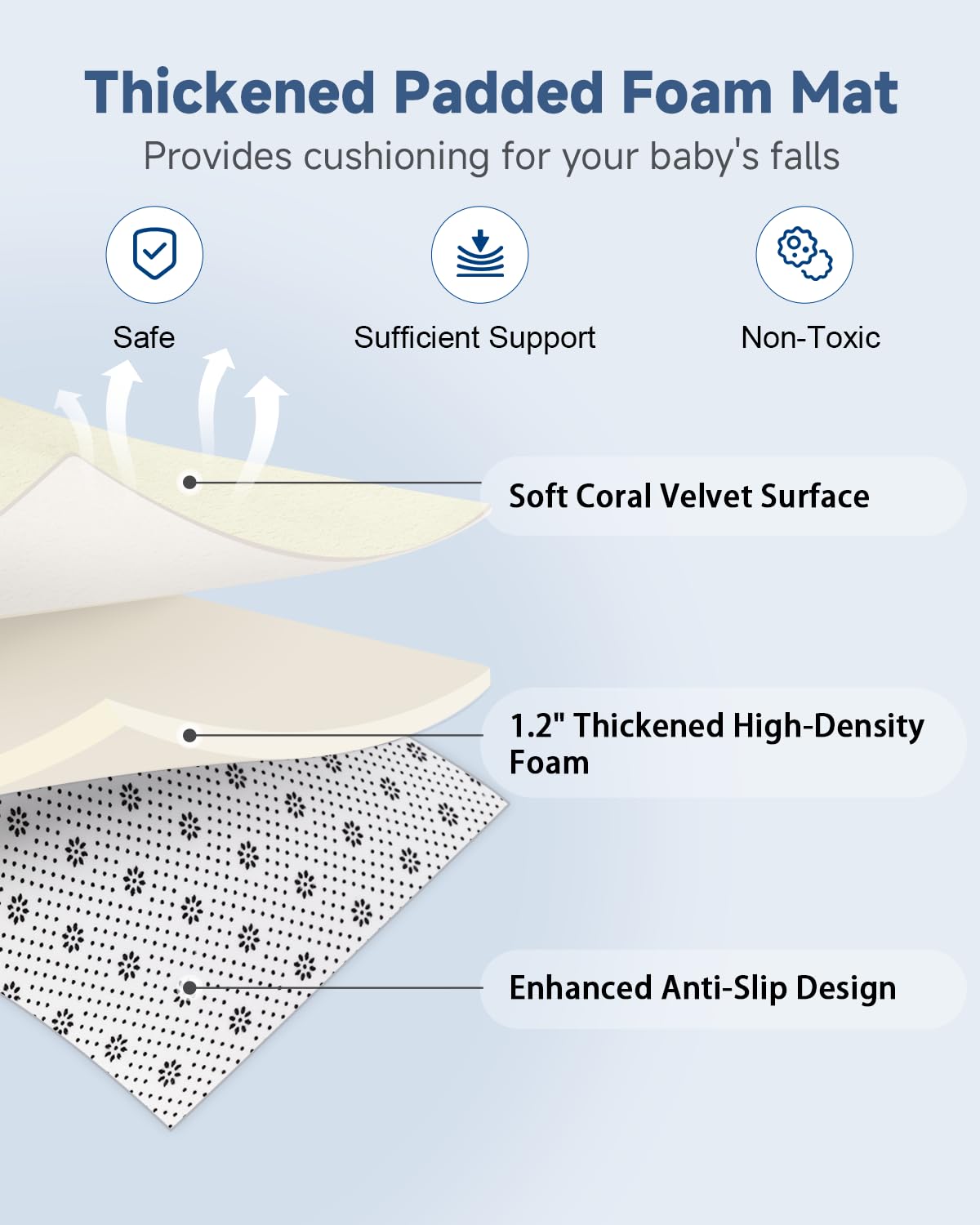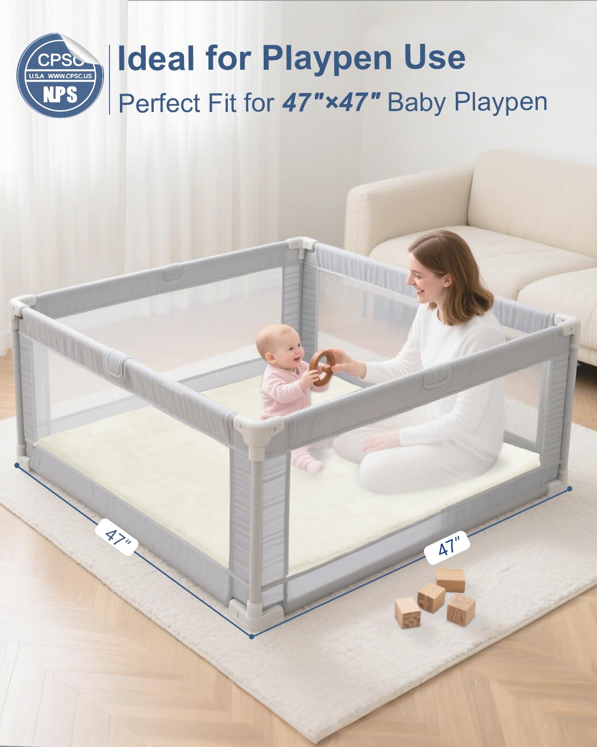 Thick Padded Foam Play Mat:The mat features a 1.2-inch thick memory foam core and ultra-soft flannel fabric surface.It's perfect for a 47x47 baby playpen,offering both support and plush comfort,providing a soft and sturdy surface for babies and toddlers to explore and play without worries of bumps or falls.