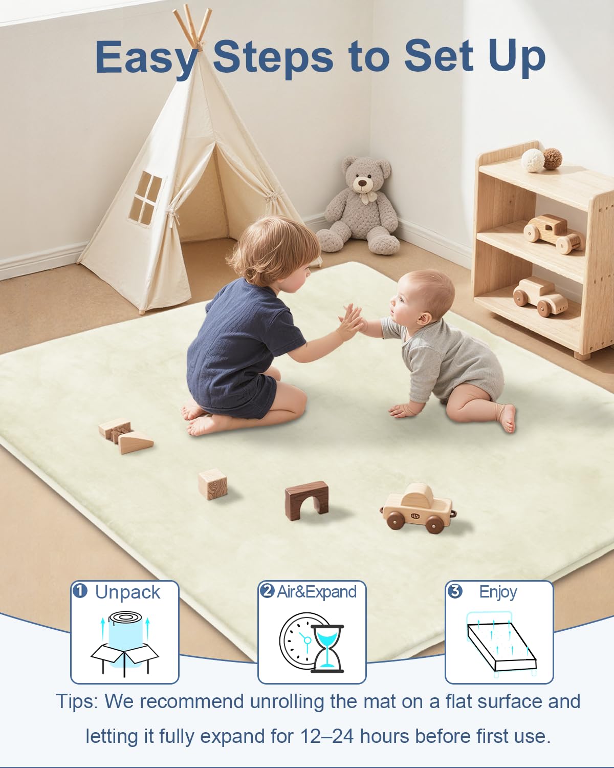 Easy Care: The play mat will expand quickly upon opening. Lay it flat for 12-24 hours before use. For daily cleaning, gently pat to remove dust or use a vacuum with a soft brush. Avoid direct sunlight for drying to maintain its quality.