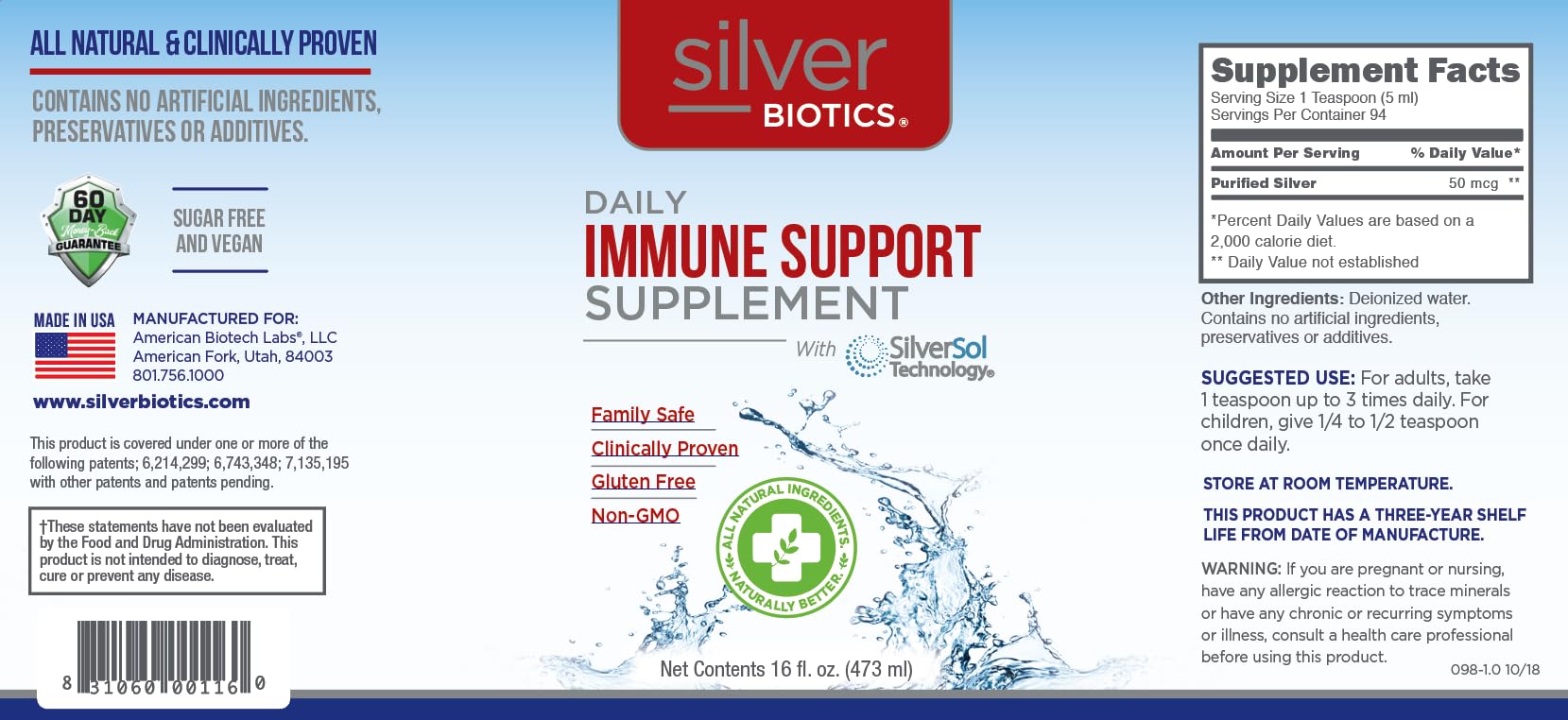 American Biotech Labs - Silver Biotics - Colloidal Silver Liquid Daily Immune Support Supplement with SilverSol Technology - 16 Fl Oz