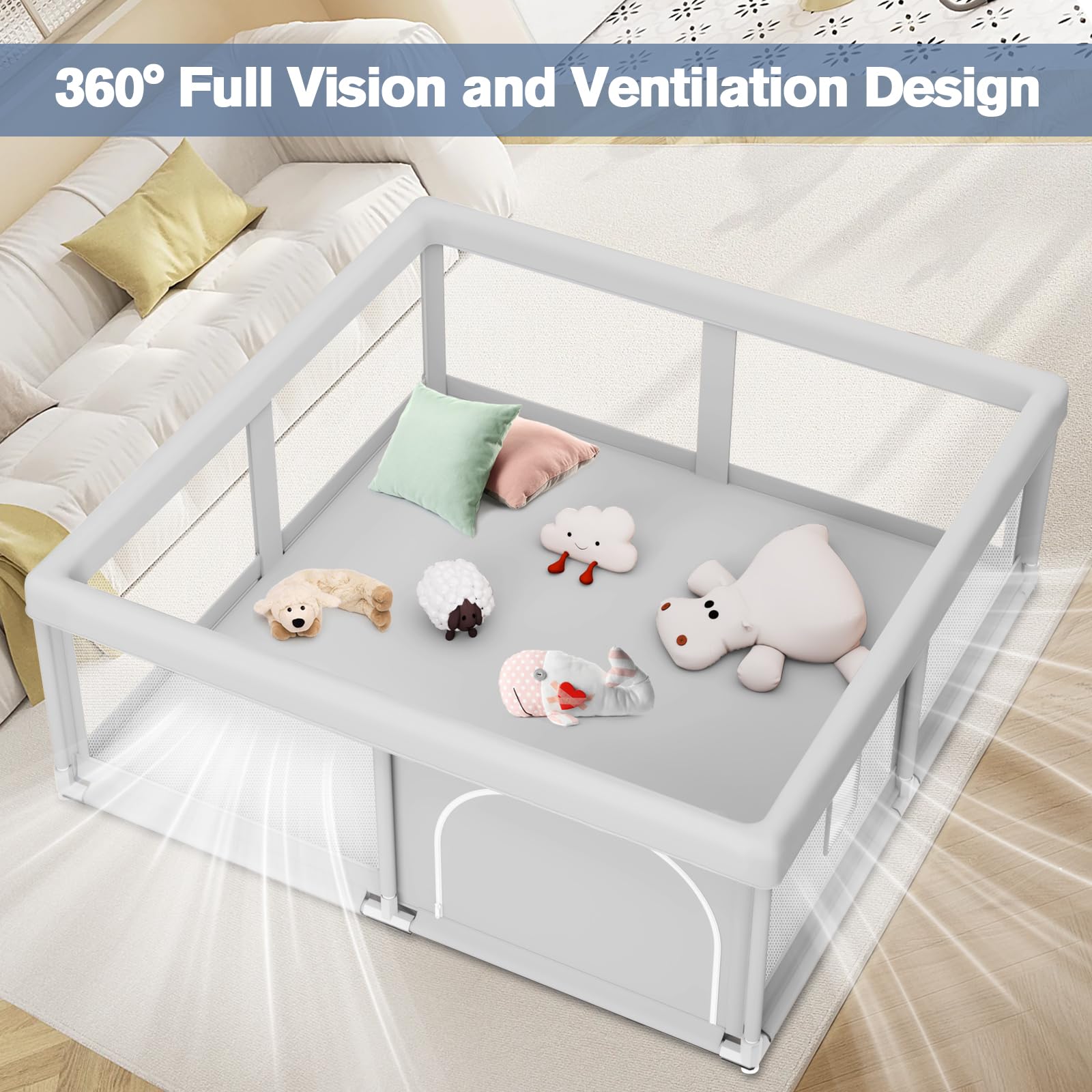 Safe No Gap Playpen for Babies - Our baby playpen constructed with oxford fabric and robust steel pipe, it is entirely covered in cloth, leaving no exposed gaps. This is preventing any pinching dangers and makes it safer than a plastic baby playpen. Additionally, the square infant playpen comes with 8 sturdy suction cups at the bottom, which Prevents baby from pushing over or moving the baby playpen.