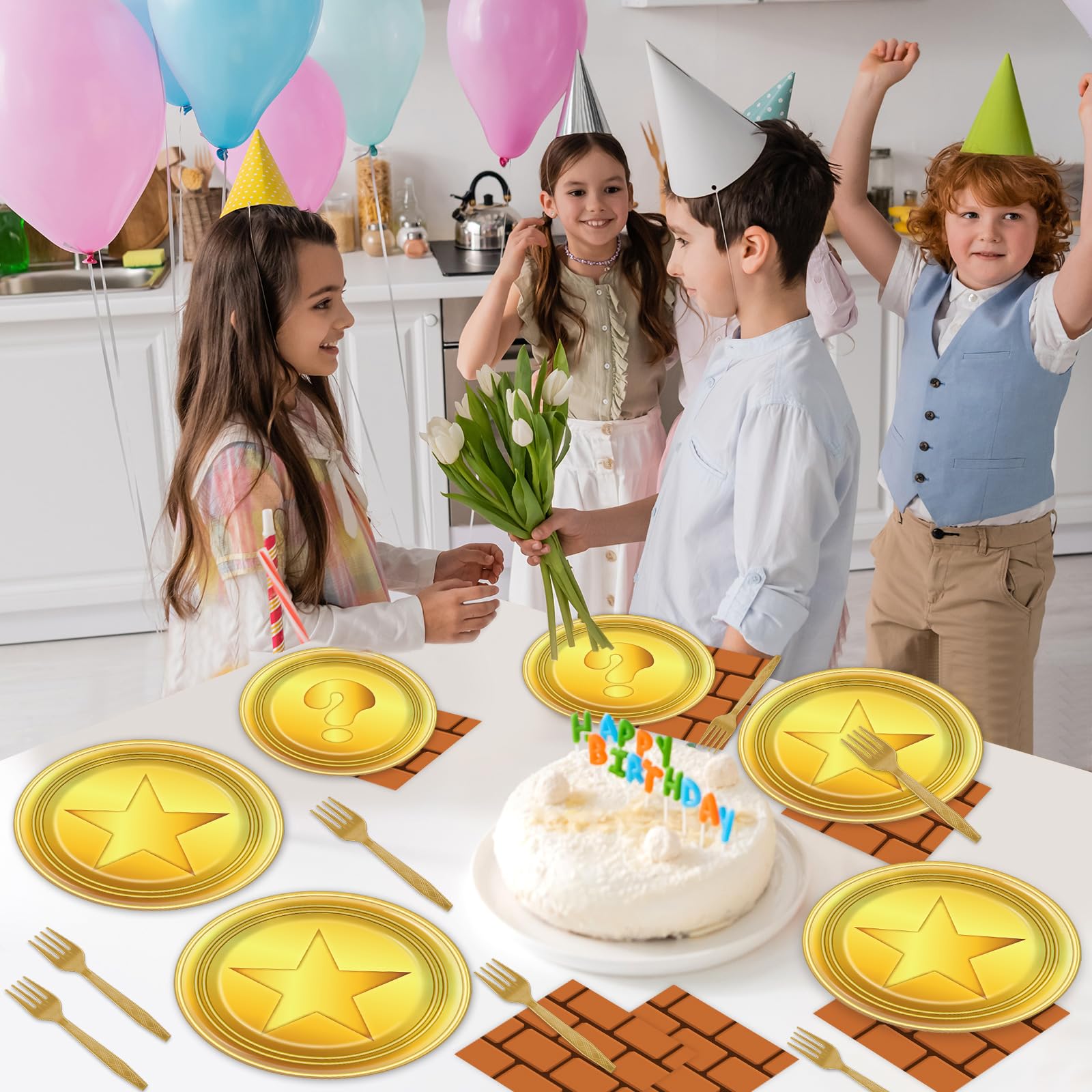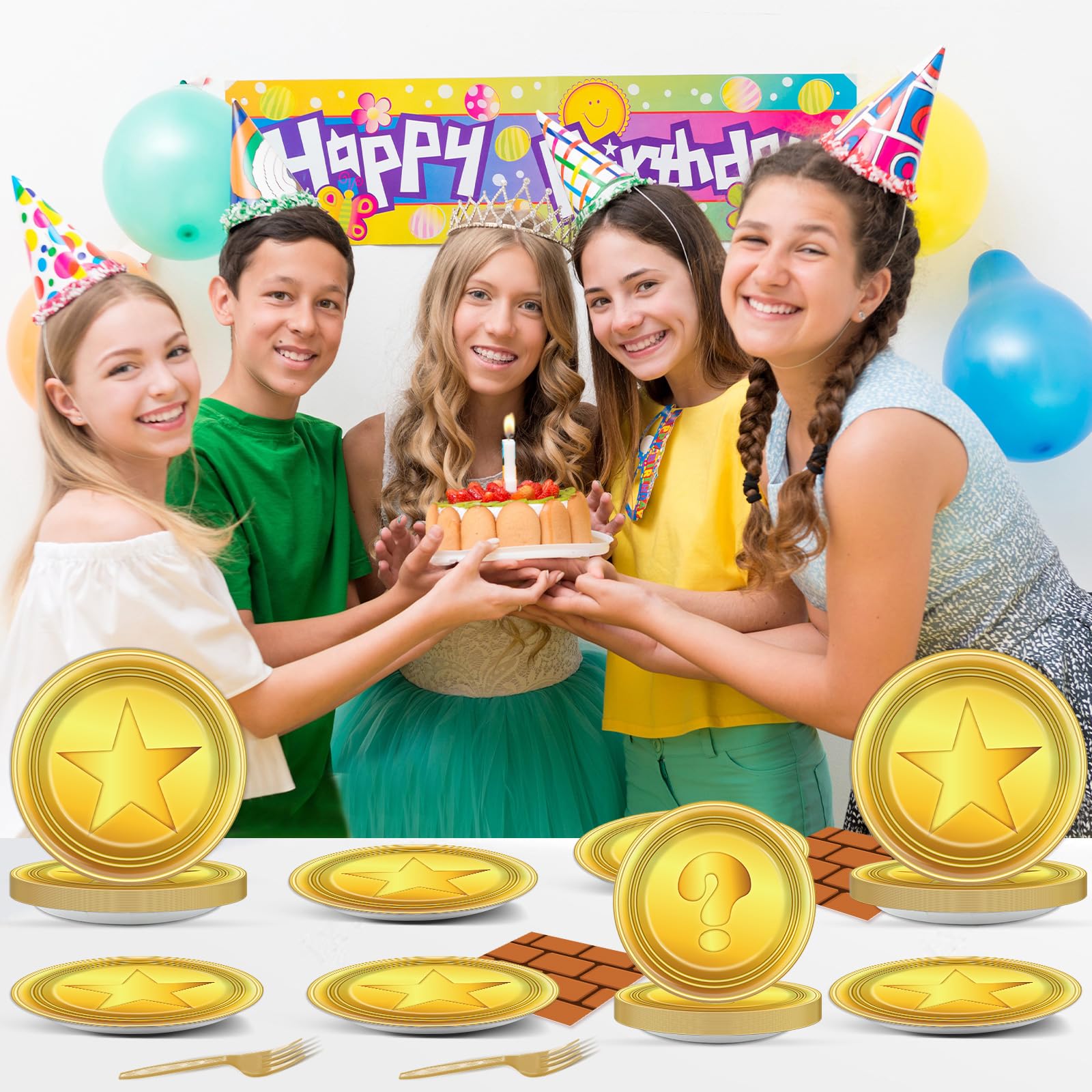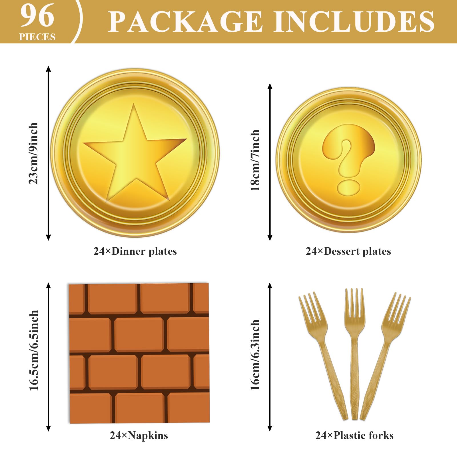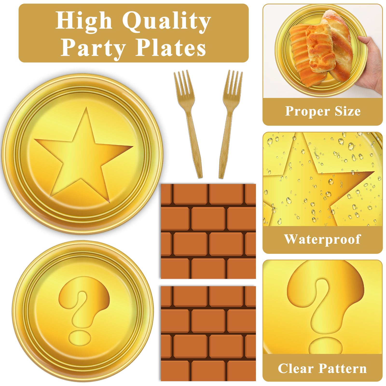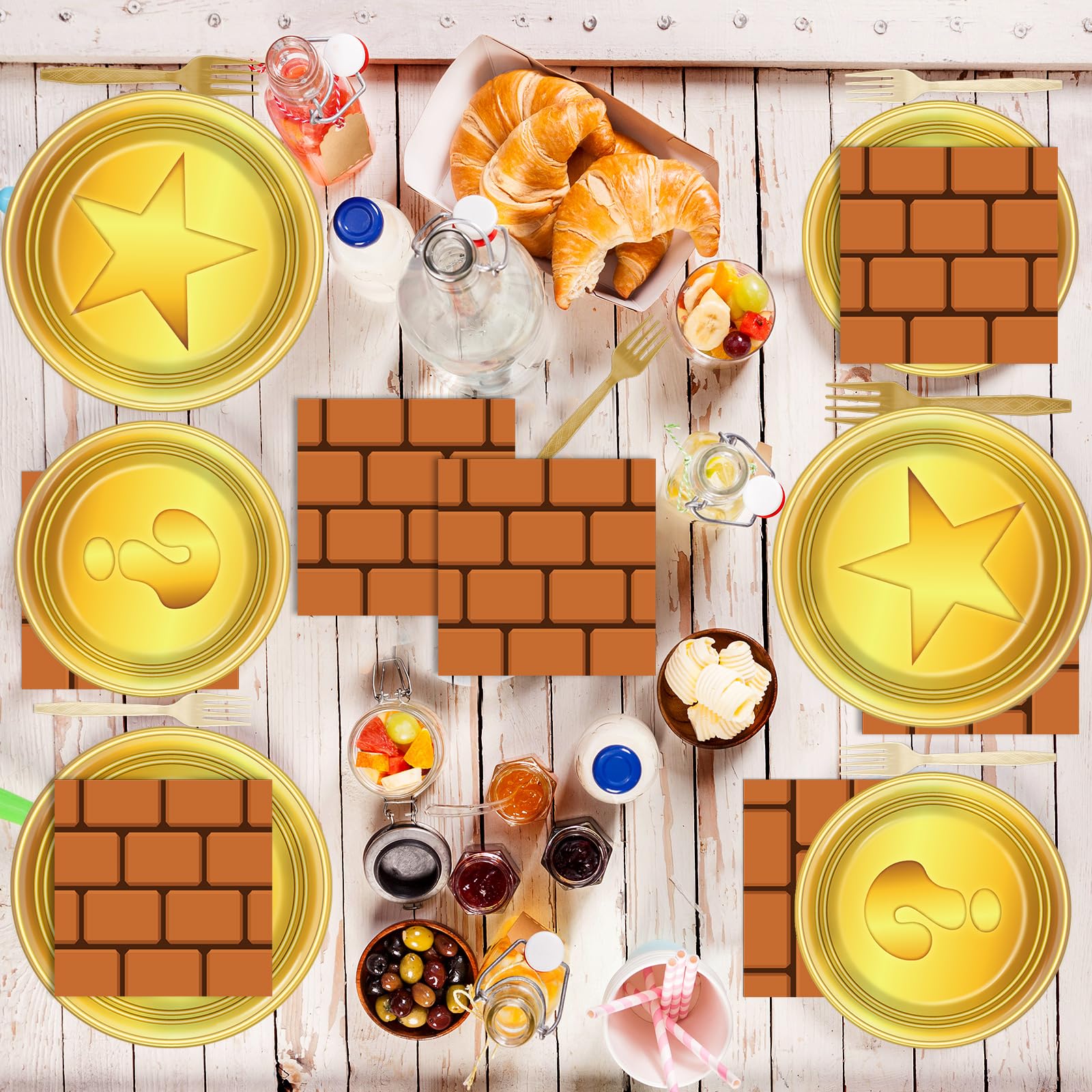 Abundant Quantity: You'll get 24 9-inch super cartoon theme party plates, 24 7-inch golden dessert plates, 24 napkins, 24 brown forks for each set that can serve 24 guests. This complete disposable dinnerware set is ideal for gaming birthday party decorations and ensures that everyone can enjoy the celebration