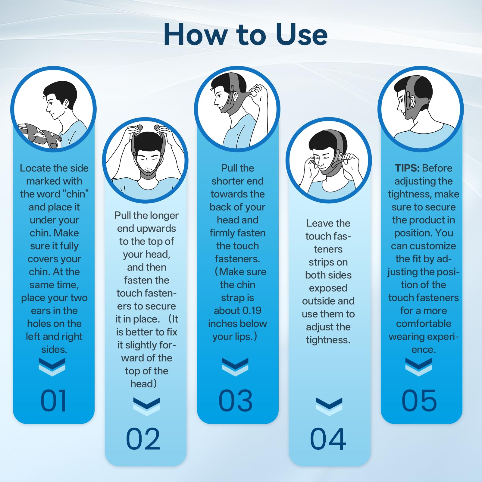 Secure and Adjustable Fit:Featuring a four-sided structure with adjustable touch fastener on all sides, this chin strap provides a customizable fit for various head sizes. You can precisely adjust the chin pressure for maximum comfort. Whether you're a side sleeper or back sleeper, it stays securely in place throughout the night without causing discomfort