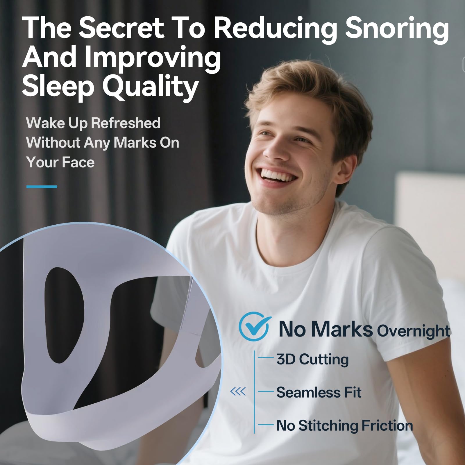 Comfortable All-Night Wear:Enjoy traceless sleep with our chin strap for sleeping. Made from advanced sports tight fabric and boasting a seamless design, it molds to your face for a snug fit. The one-piece molding ensures there are no irritating seams, so you can wake up without any marks on your skin