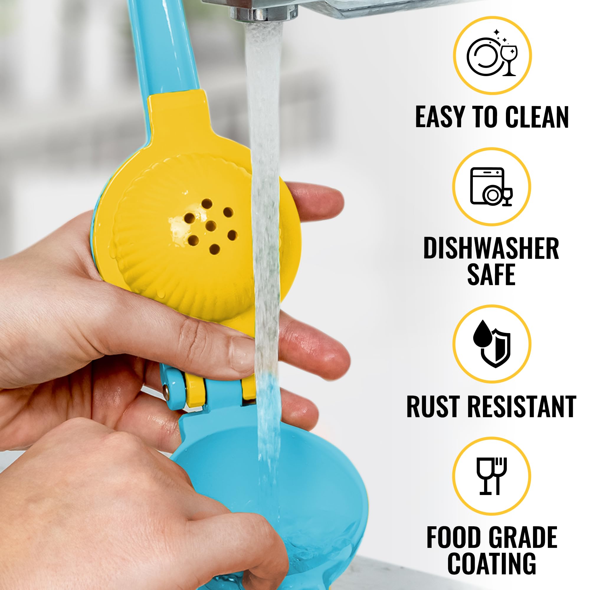 CLEANS IN SECONDS: After adding a tangy flavor to your recipe, simply toss the citrus juicer in the dishwasher for a quick clean up. Our juice press can also be effortlessly cleaned by running it under water.
