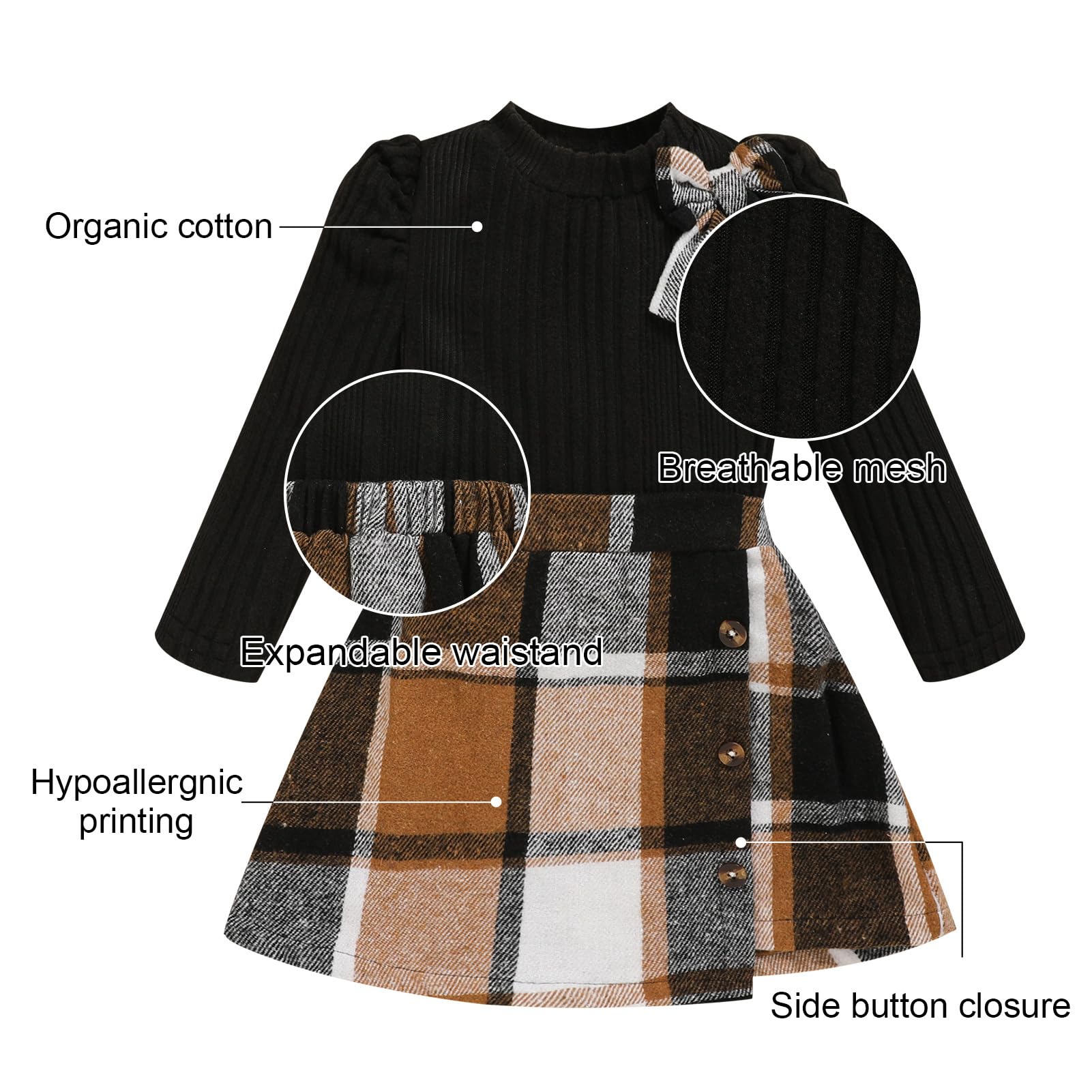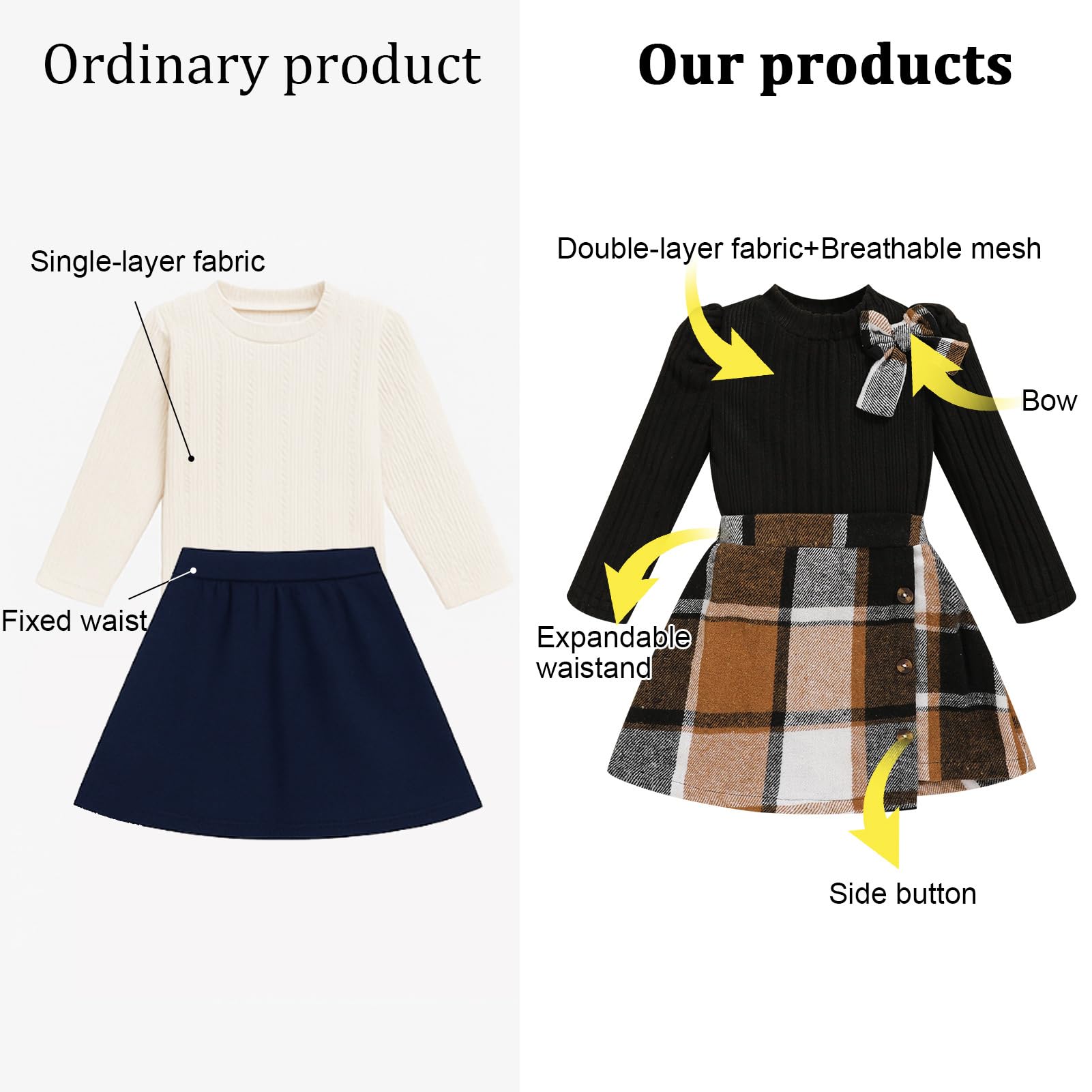 MATERIAL: Toddler girl shirt sweater top is made of cotton and polyester, bottom skirt is made of cotton blend and polyester, soft, breathble, and comfortable, sweet toddler baby girl 2 piece skirt set, cute baby girl clothes.