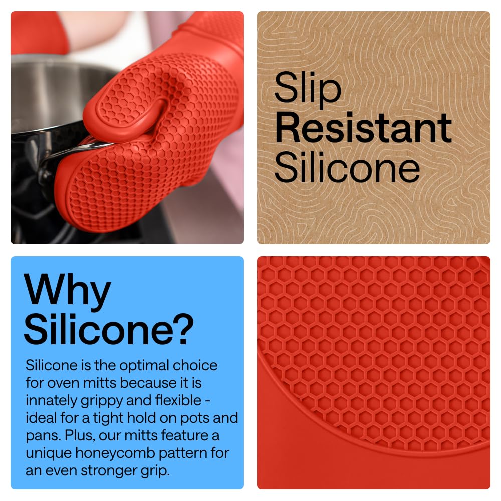 GET A BETTER GRIP: the best oven mitt pair; constructed of durable silicone, mitts are naturally slip resistant, helping you to get the best grip while you cook; unique textured honeycomb pattern helps you hold tight to pans, pots and baking sheets without hindering your natural grip