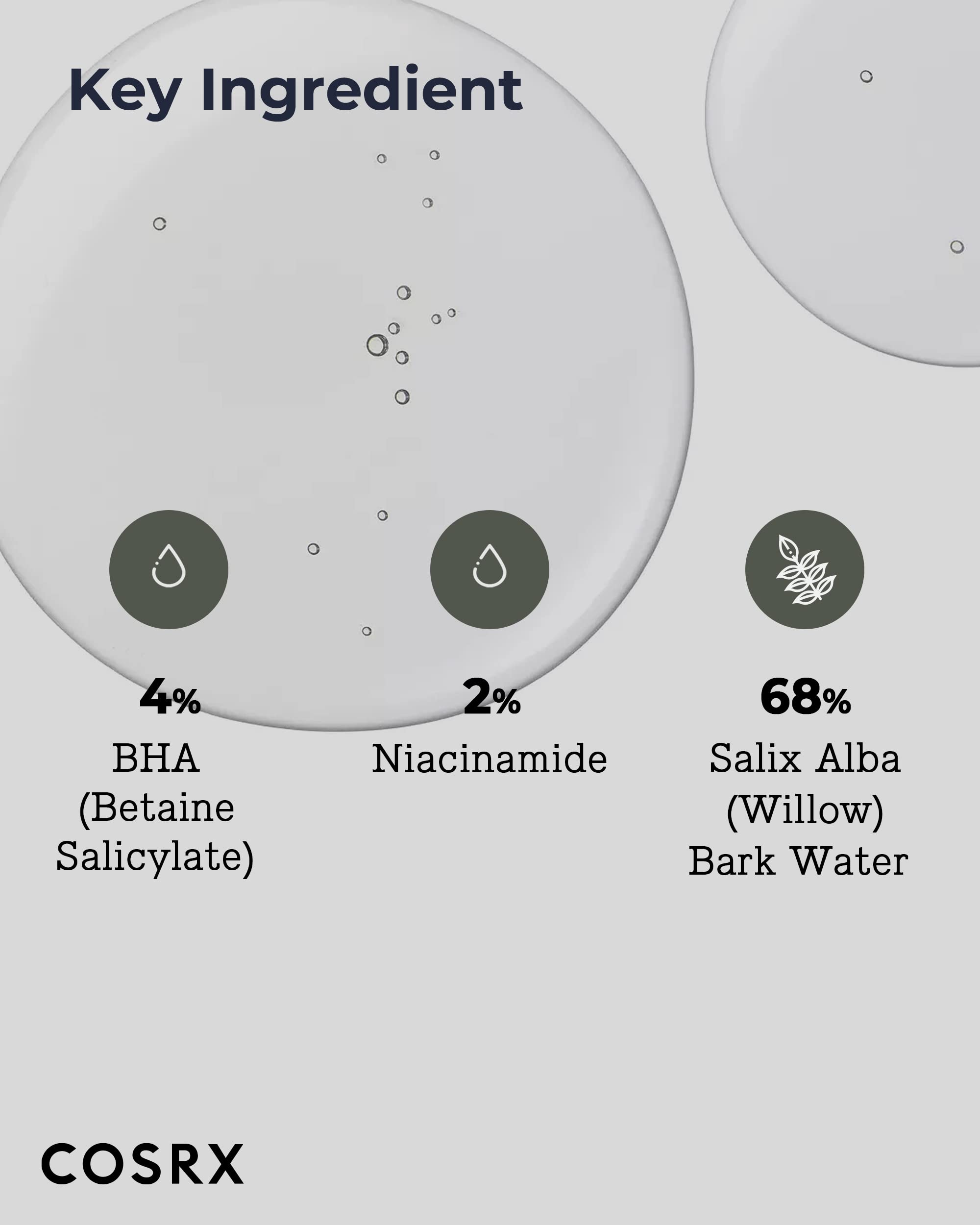 CONCENTRATED BHA LIQUID: Formulated with 4% BHA (Betaine Salicylate), this product visibily diminishes enlarged pores and dead skin cells, replacing it with natural radiance while evening out your skin tone.