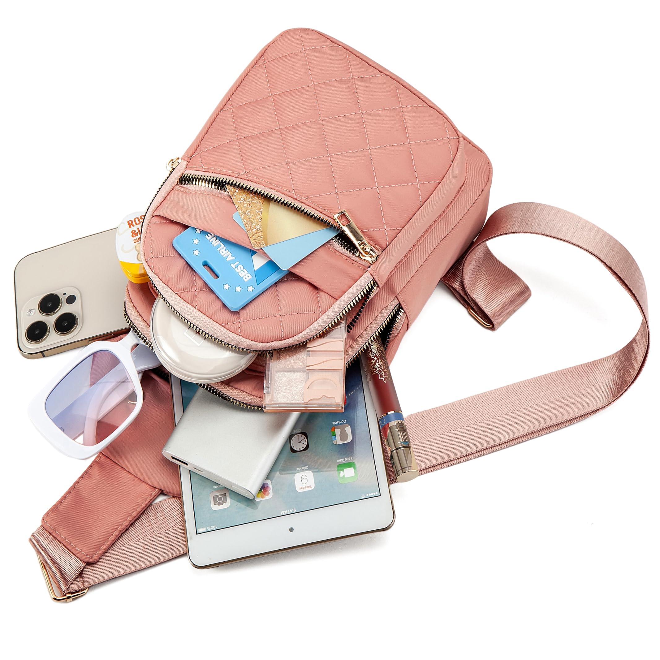 Dimension: 11.3" x 6.8" x 3.6" (Please Note The Bag Dimension). The Sling bag with multiple compartments and pockets, can hold your phone, wallet, cards, passport, key and any essentials in daily life. Internal zipper pocket is safe for protecting your valuable items inside.