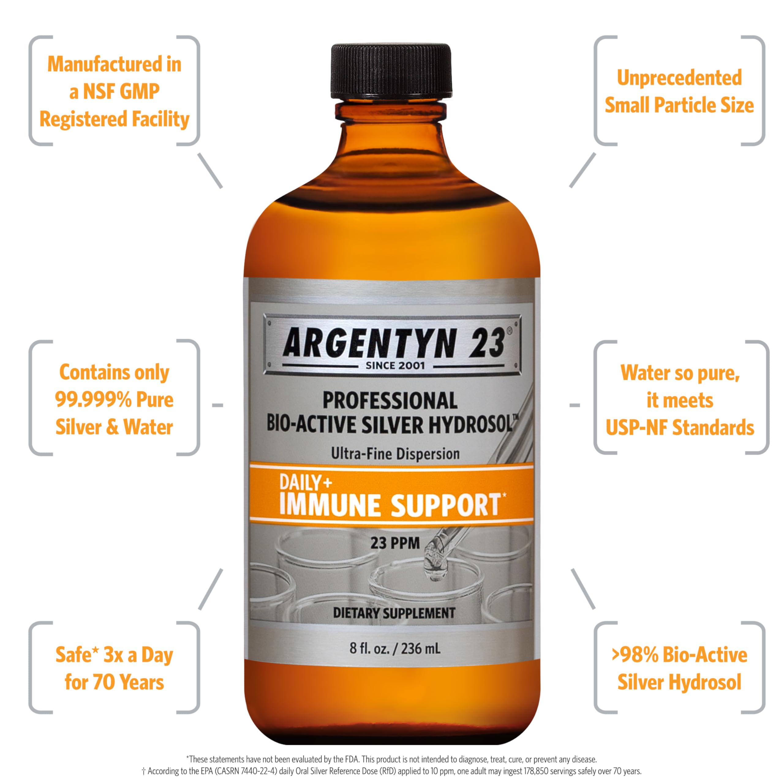 SAFE AND EFFECTIVE - Argentyn 23 is formulated to be safe for adults and kids alike. When taken three times daily for 70 years, it still falls below the EPA daily Oral Silver Reference Dose (RfD)
