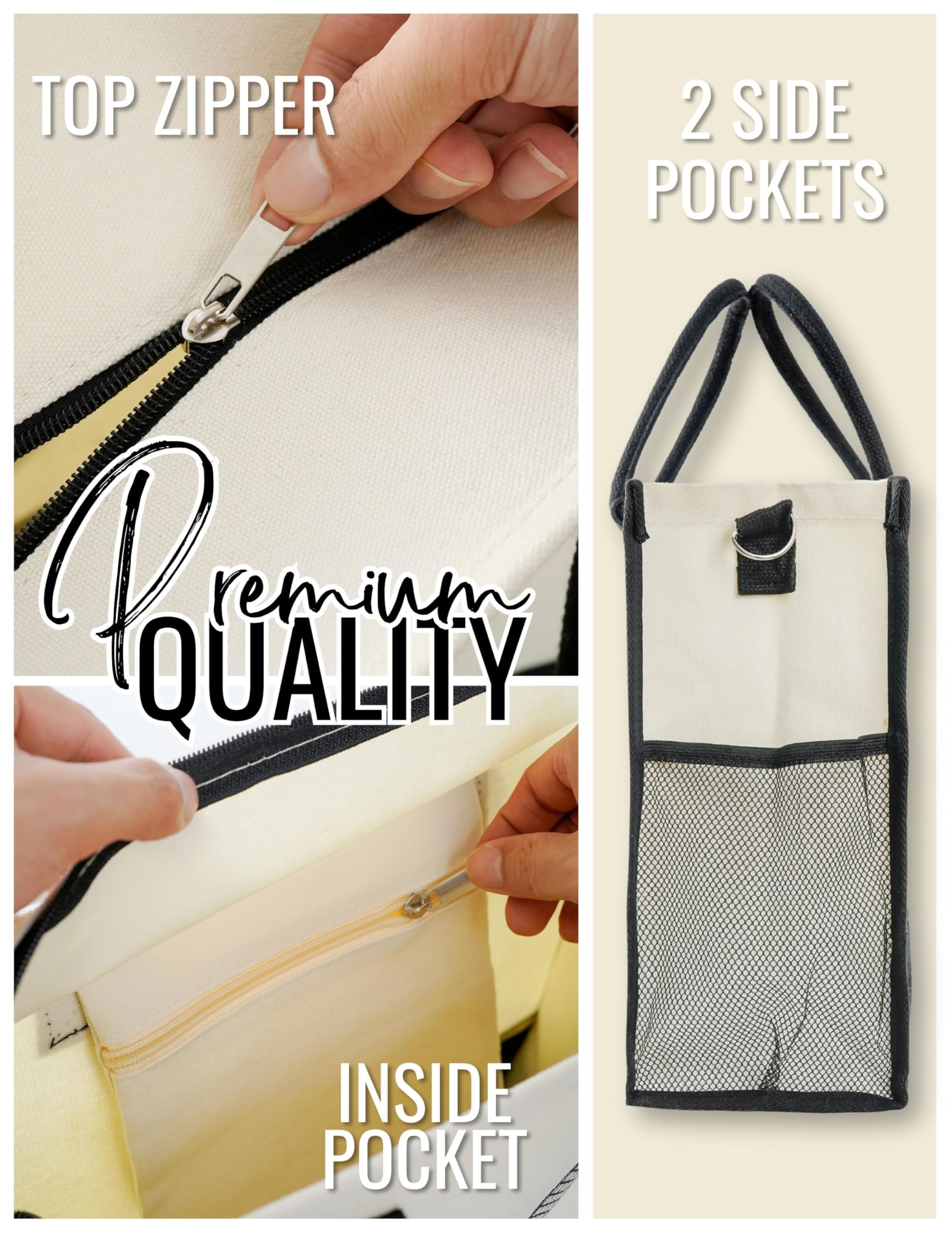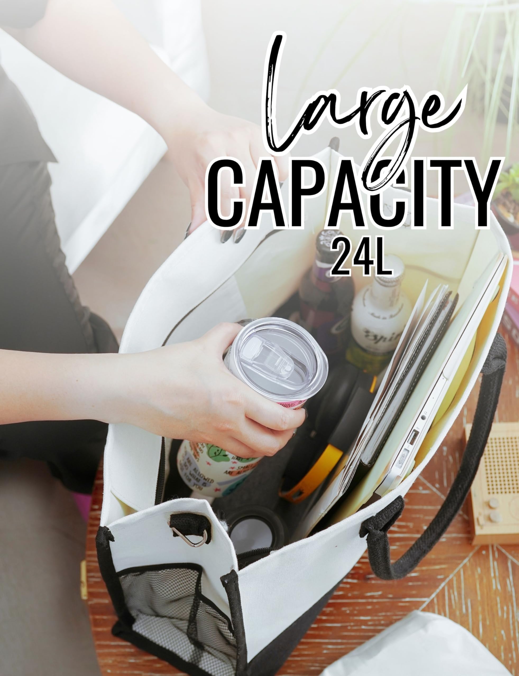 Attention to Detail: The large tote bag (17" x 13" x 6.5") can hold a laptop, iPad, and other daily essentials. It features a top zipper to prevent items from falling out. Inside, there is a zippered pocket for keys, wallet, and earbuds, and two side pockets for a water bottle and umbrella.