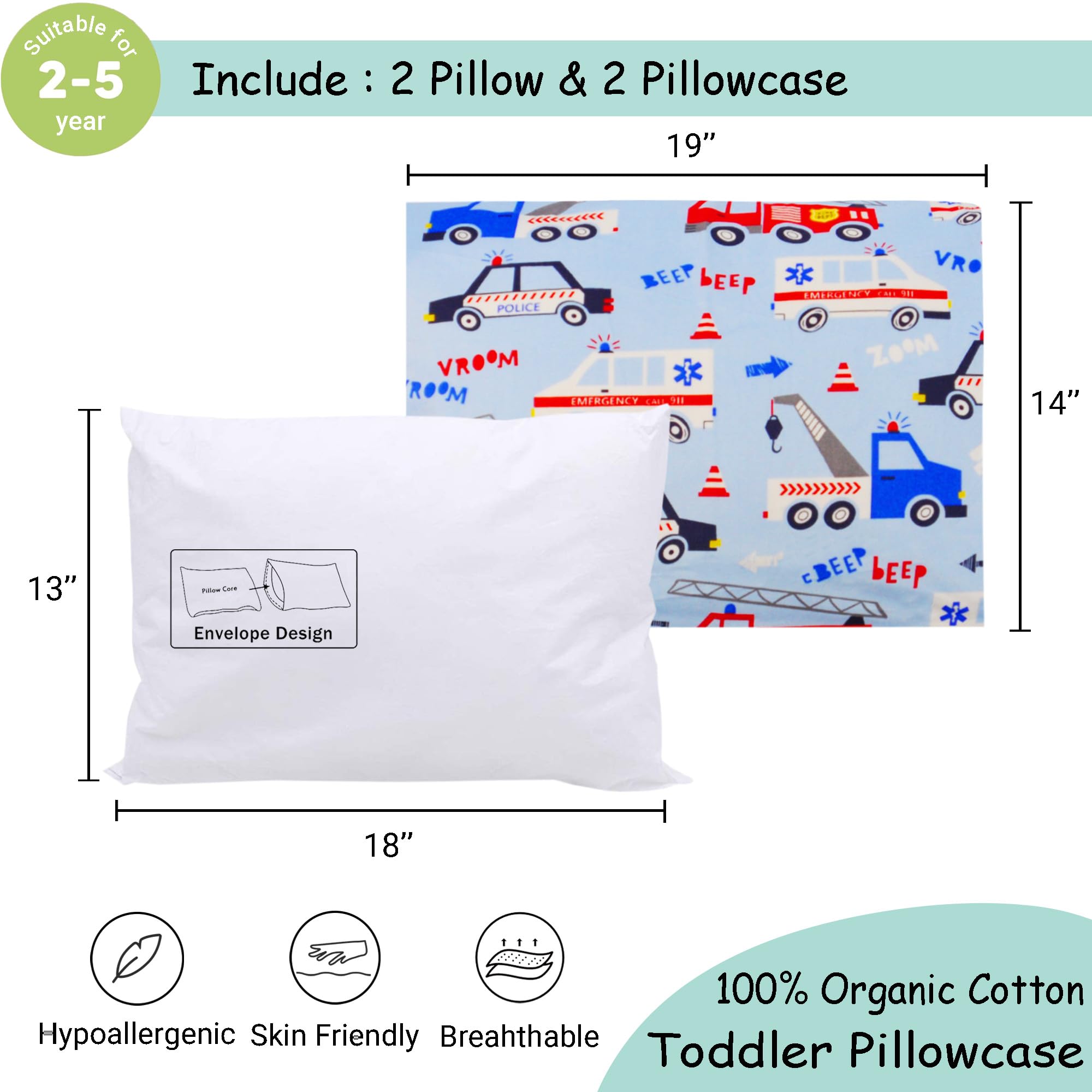 PACKAGE INCLUDE: 2 toddler pillow 13x18 and 2 toddler pillowcase 14x19, After opening the package, please wash and dry the pillow to regain its fluffiness