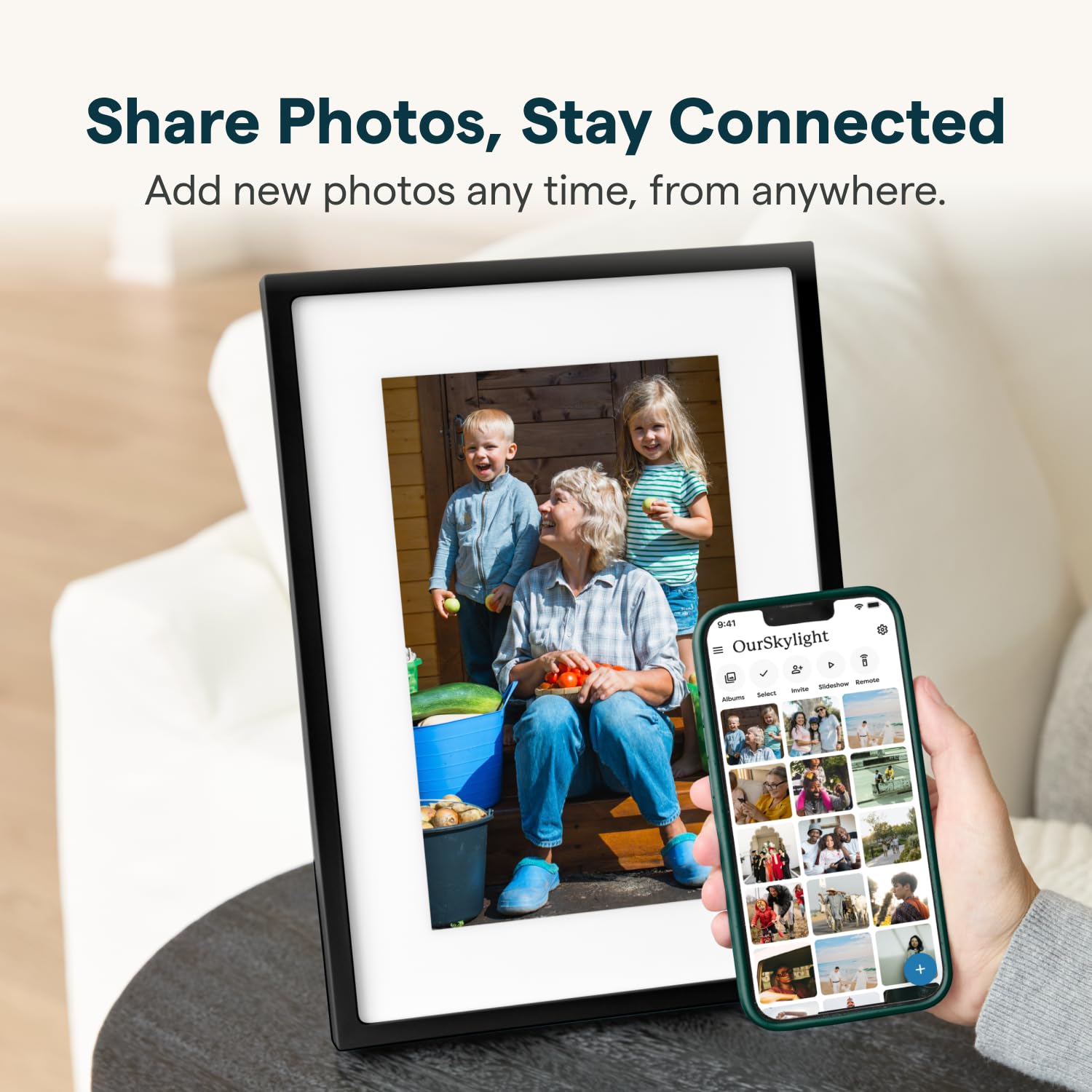 UPLOAD PHOTOS AND VIDEOS INSTANTLY: Easily share photos and videos directly from your phone to the digital frame, turning it into a vibrant photo display. It's the ideal photo gift for any occasion. Stay connected with loved ones by sending special memories, no matter the distance.