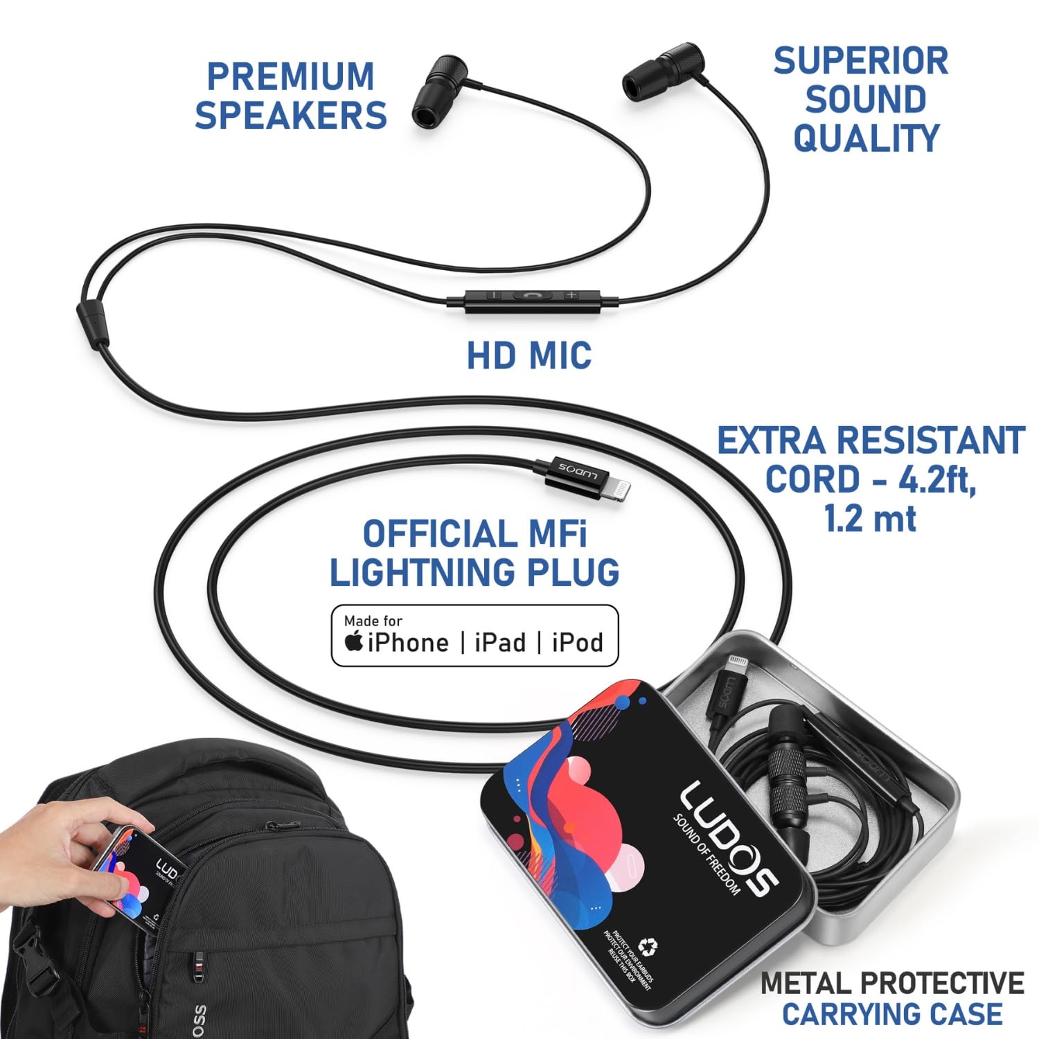 🎵 Strong: These lightning earbuds wired feature rock solid design and a extra long 4.2 ft cord (1.2 mt); iphone 14 headphones wired with mics are designed to be super tough and withstand the most demanding conditions; When you need lightning earbuds for performance, trust only LUDOS
