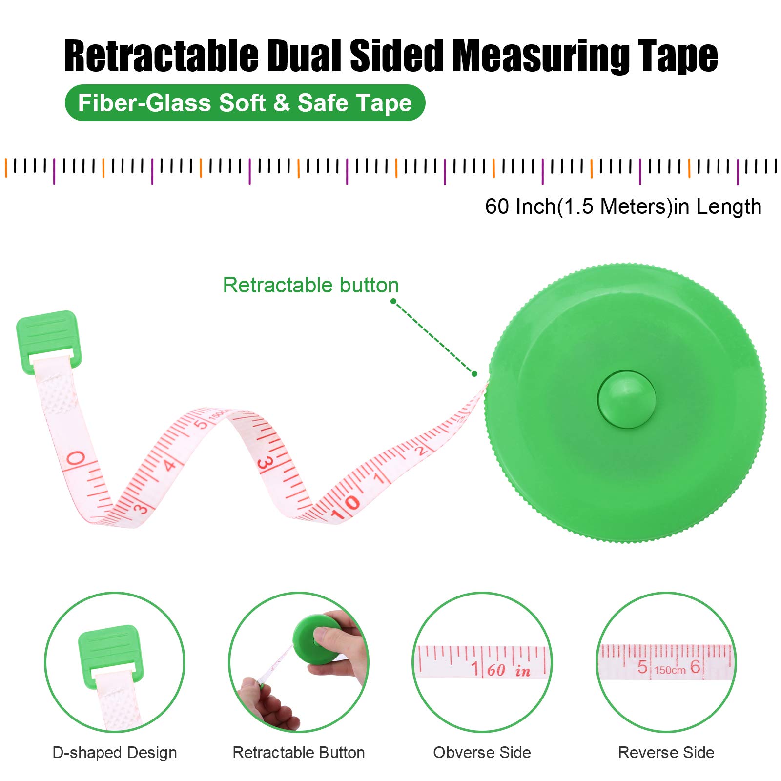 【Flexible&Durable】Made of non-stretch fiberglass makes the tape measure soft and durable. So the tape can measure round or straight objects and will last for a long time for daily use.