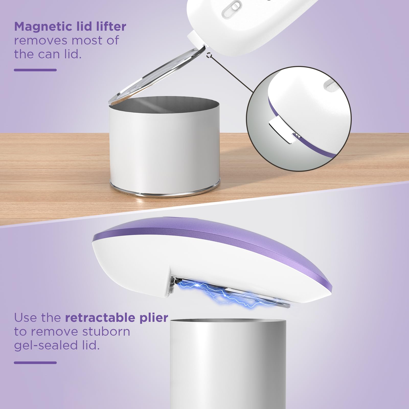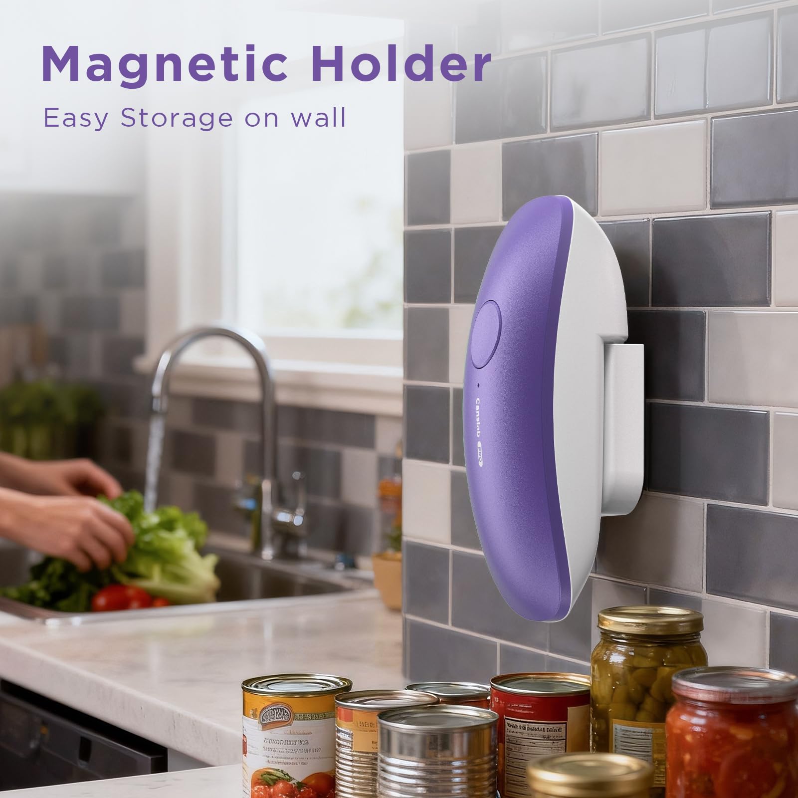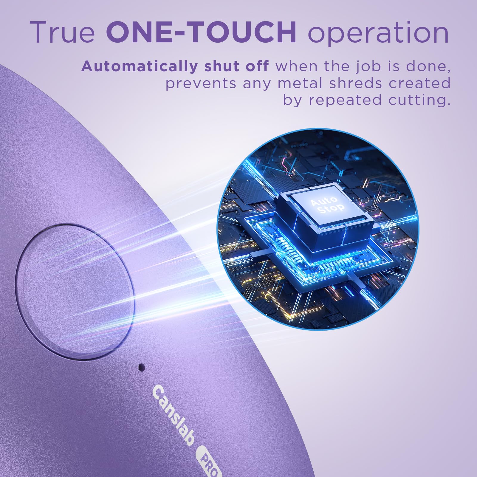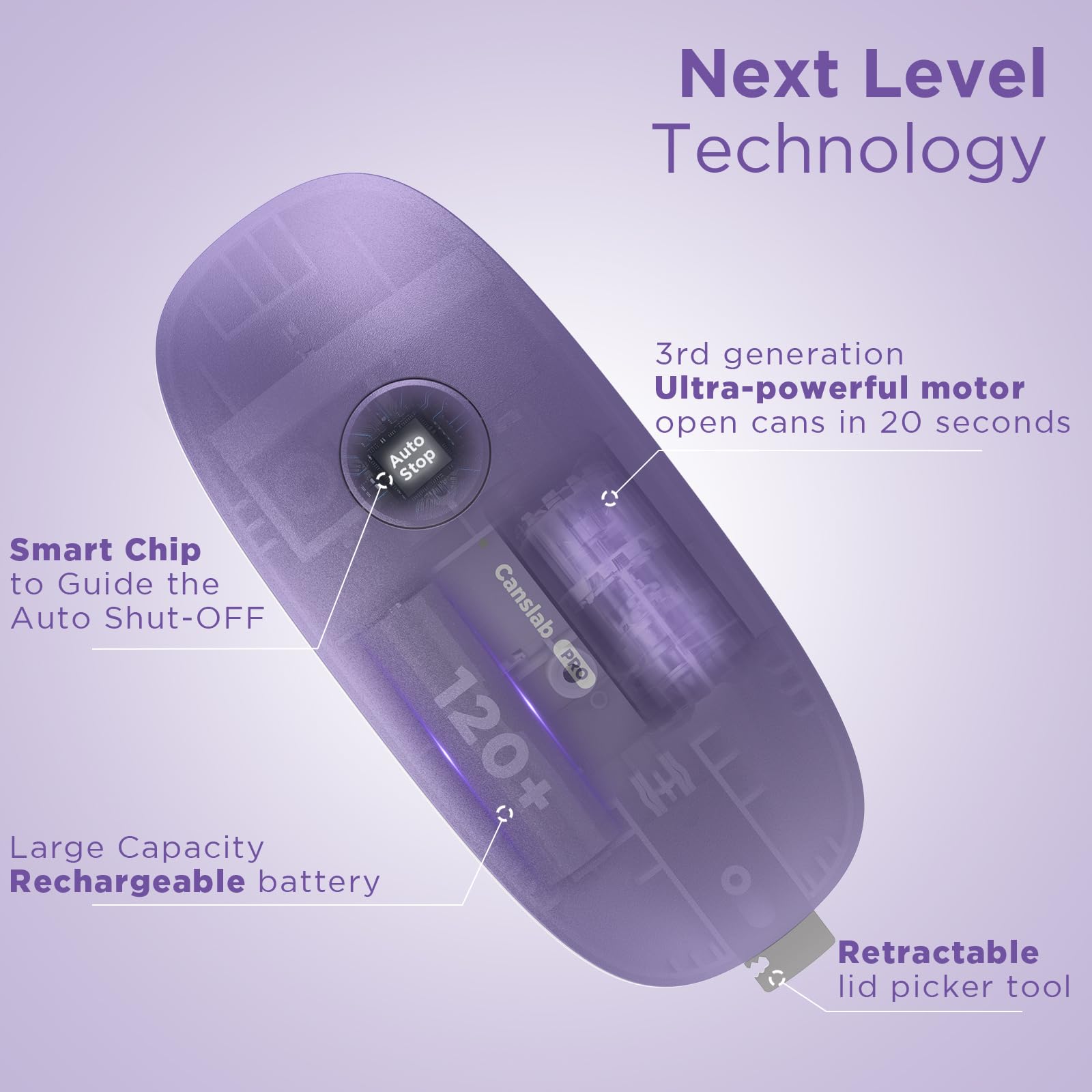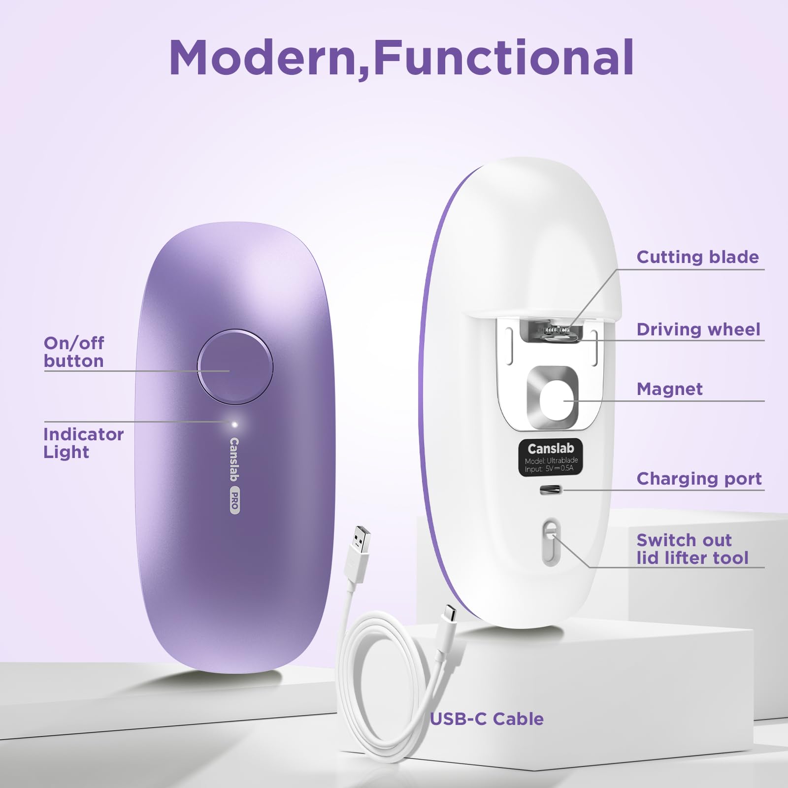 【Advanced PRO model 】 – Beauty, brains and power.The Canslab Ultrablade PRO brings kitchen can opener into modern times with its powerful motor, easy-to-use design, and stylish appearance. Autop stop, reduced noise, faster and more steady cutting, fast USB rechargeable, easy one touch operation, magnetic lid lifter, smooth edge, food safe, easy storage are some of the enhanced features built into the sleek and ergonomic purple electric can opener.