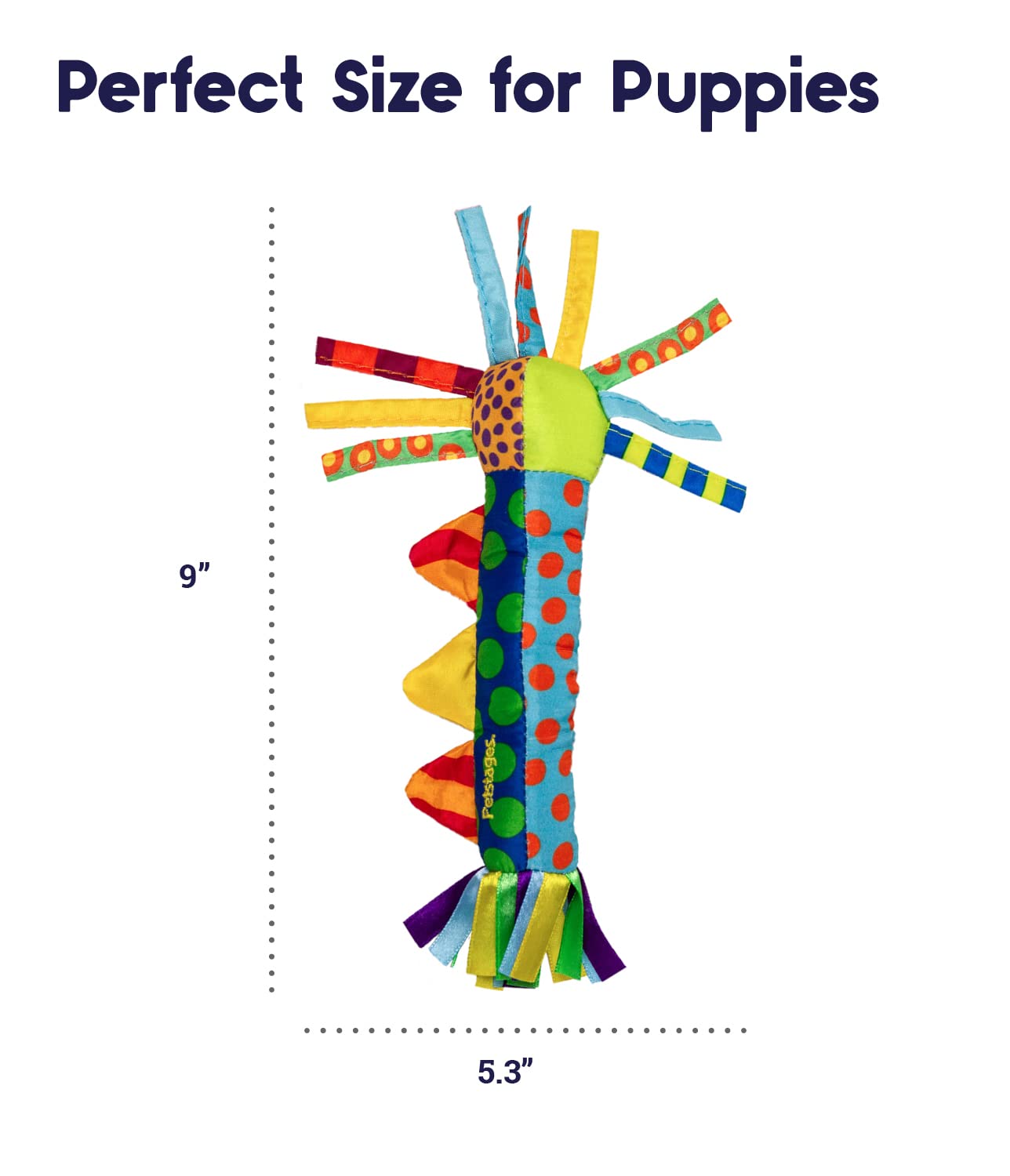 The Cool Teething Stick by Petstages is an ideal solution for teething puppies and dogs with inflamed gums. The bright cotton-poly blend fabric and stuffed interior make freezing and reusing this toy a cinch. Just simply soak in water, place in the freezer, and remove once frozen. Your pup will enjoy the soothing, icy relief and the crunchy texture of that this frozen teething stick provides their achy gums. Fun streamers and ribbon ends add some fun and texture to gnaw on. This toy is free of lead and phthalates. Remove this toy from your dog once it has thawed to extend its usage. Not intended to be used as a chew toy.