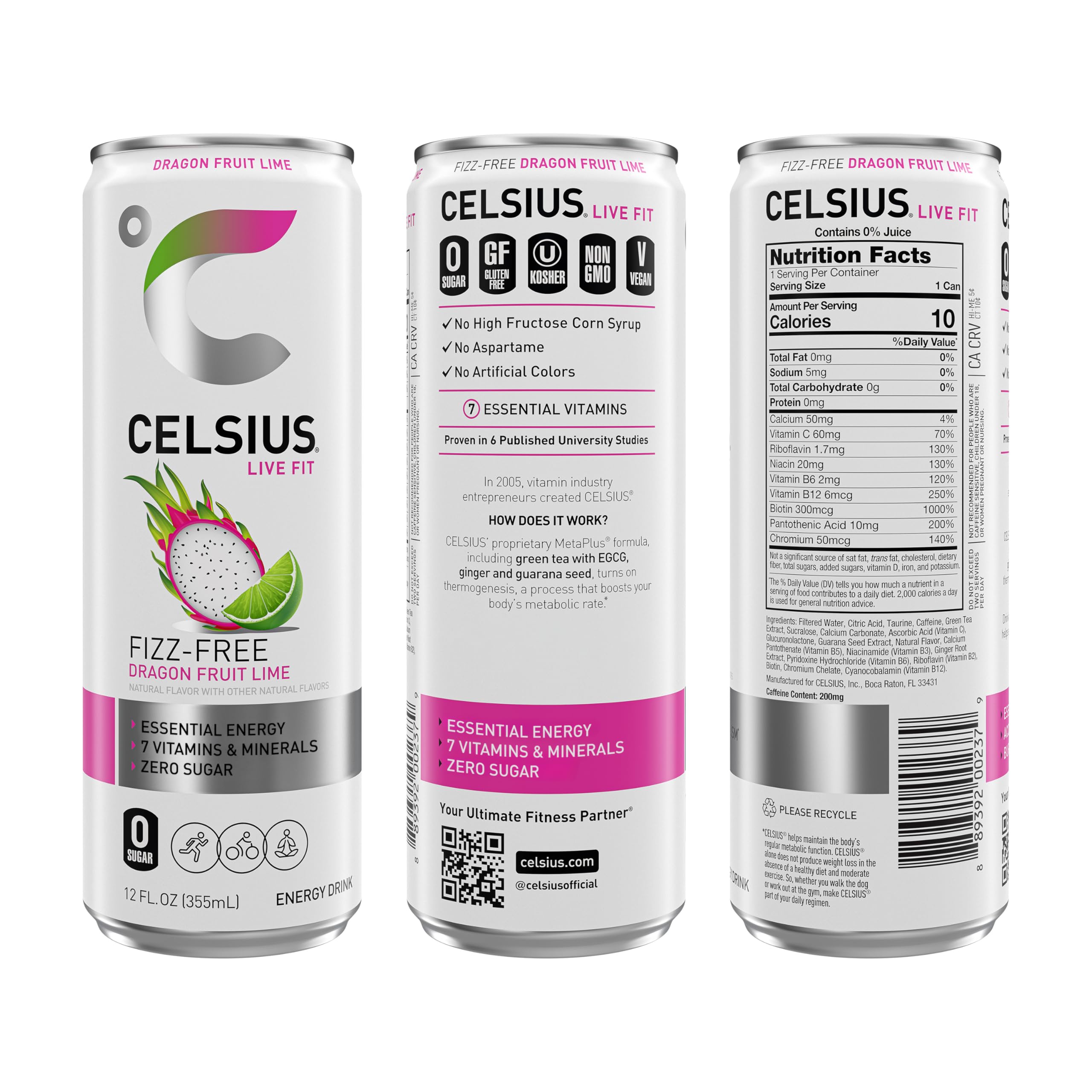 CELSIUS® is functional, Essential Energy, a better-for-you, premium alternative to traditional energy drinks. As a global, lifestyle fitness drink, CELSIUS® was created to help people LIVE FIT, exceed their goals and elevate their everyday lives. Made with proven, premium ingredients, 7 Essential Vitamins and zero sugar, no artificial colors, no aspartame, no high fructose corn syrup and non-GMO. CELSIUS® is vegan, gluten-free and Kosher. Our proprietary MetaPlus blend contains green tea extract with EGCG. It also includes guarana seed extract, ginger root for flavor and digestion, vitamin C to help support your immune system, vitamin B for energy production, and chromium to help control hunger, making it an ideal pre-workout drink. Our CELSIUS Fizz-Free Dragon Fruit Lime energy drink flavor is where tropical adventure meets a zesty twist! This bold and refreshing flavor blends the exotic sweetness of dragon fruit with the vibrant tang of lime, creating a perfectly balanced taste that’s as energizing as it is unique. Made with clinically proven ingredients, this non-carbonated flavor of CELSIUS® has the perfect balance of flavor and energy that serves as an awesome pick-me-up for active lifestyles. Make CELSIUS® your go-to choice for Essential Energy!