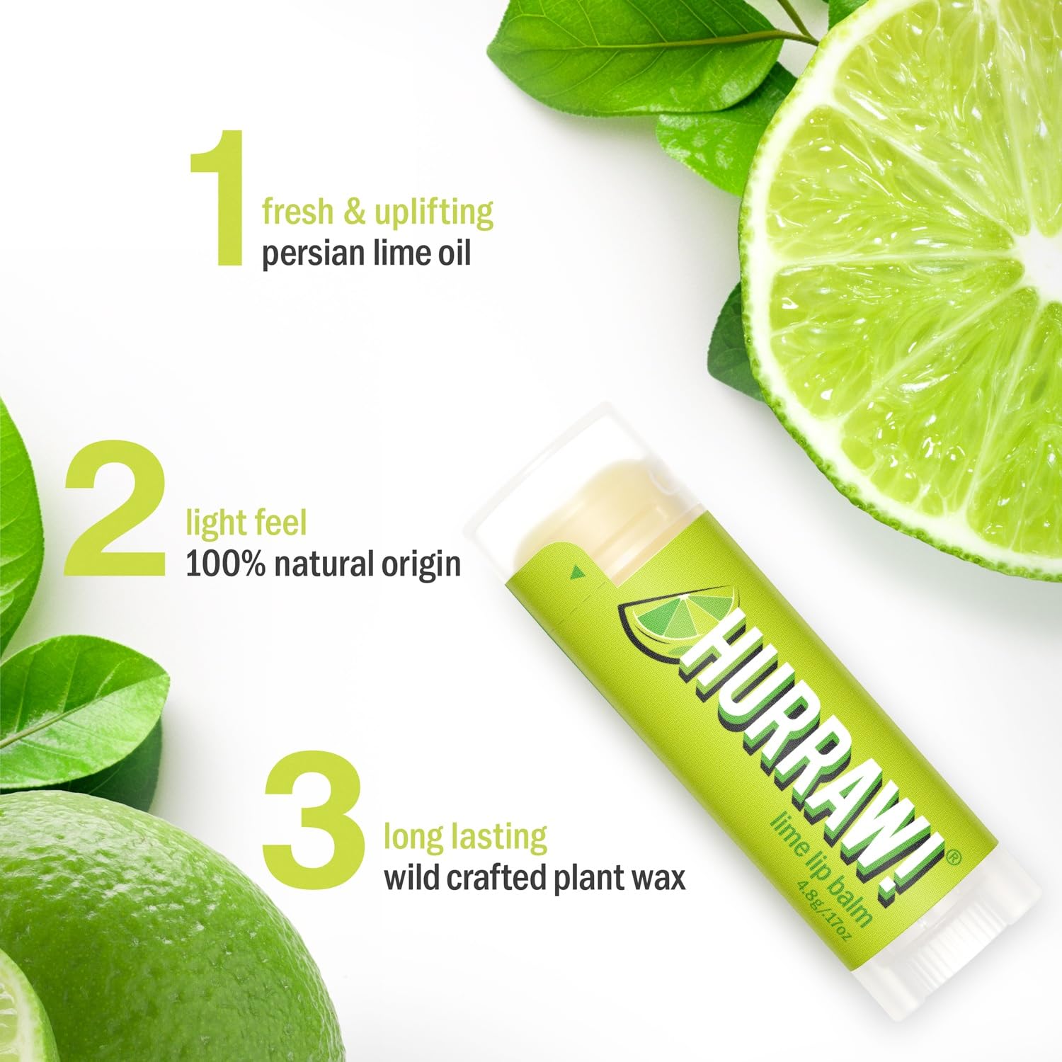 ONE 4.8g/.17oz Oval Tube of Lime Lip Balm packaged in a white HURRAW! branded pillow box. Tiny green giants! Just like squeezing a lime slice in your favorite summer drink or remembering those limeade popsicles of youth... Persian lime oil lends our lime balm some serious zest! Made with certified organic, vegan, and raw ingredients. Hurraw! Lip Balms are certified 100% all natural origin, cruelty and gluten free. Non-GMO. Bee, Shea, Soy and Palm Free.
