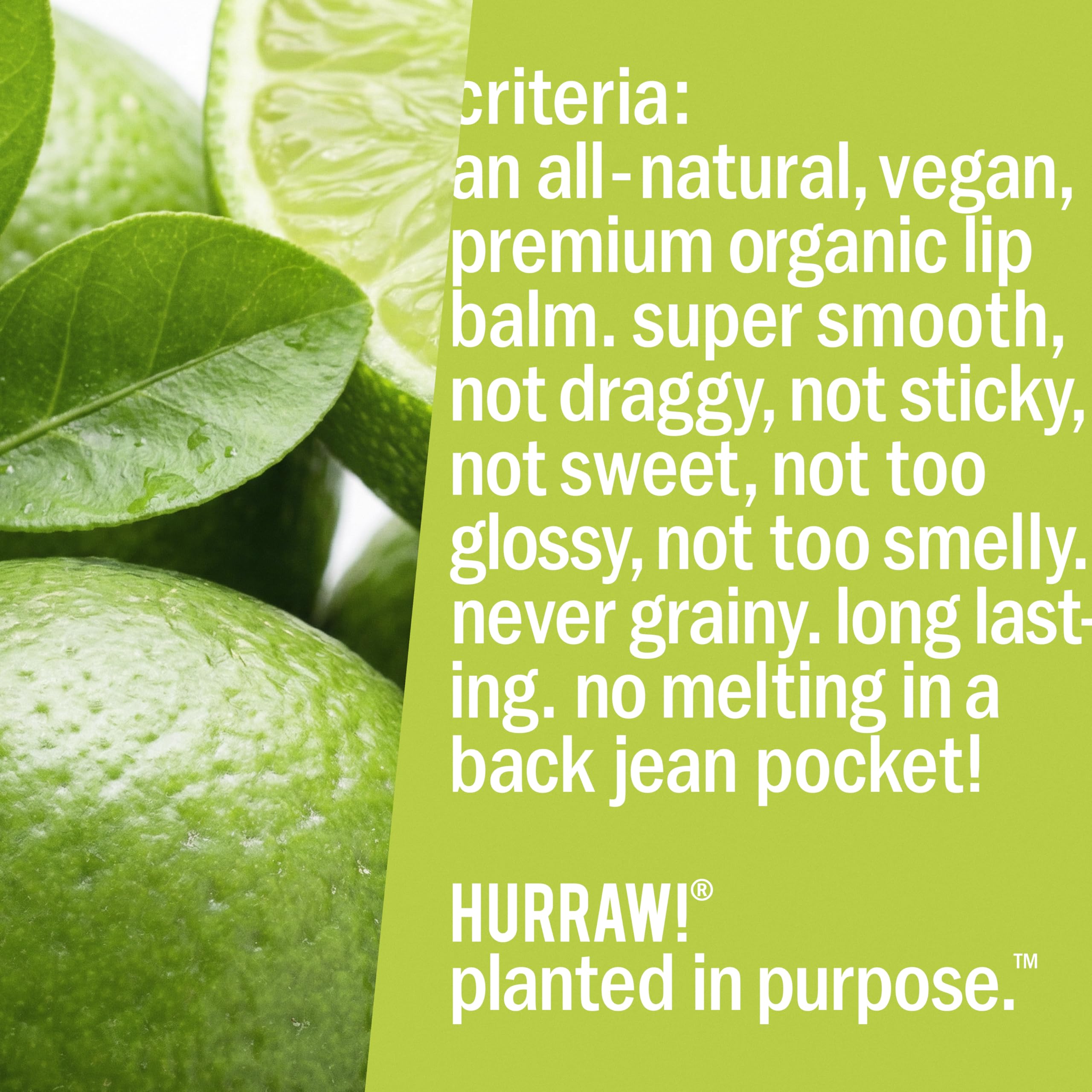CRITERIA: Hurraw! Lip Balms are all natural, vegan, raw, made with premium fair trade ingredients, super smooth, not draggy, not sticky, not sweet, not too glossy, not too smelly. Never grainy. Long lasting and no melting in a back jean pocket! Made in Montana, USA.