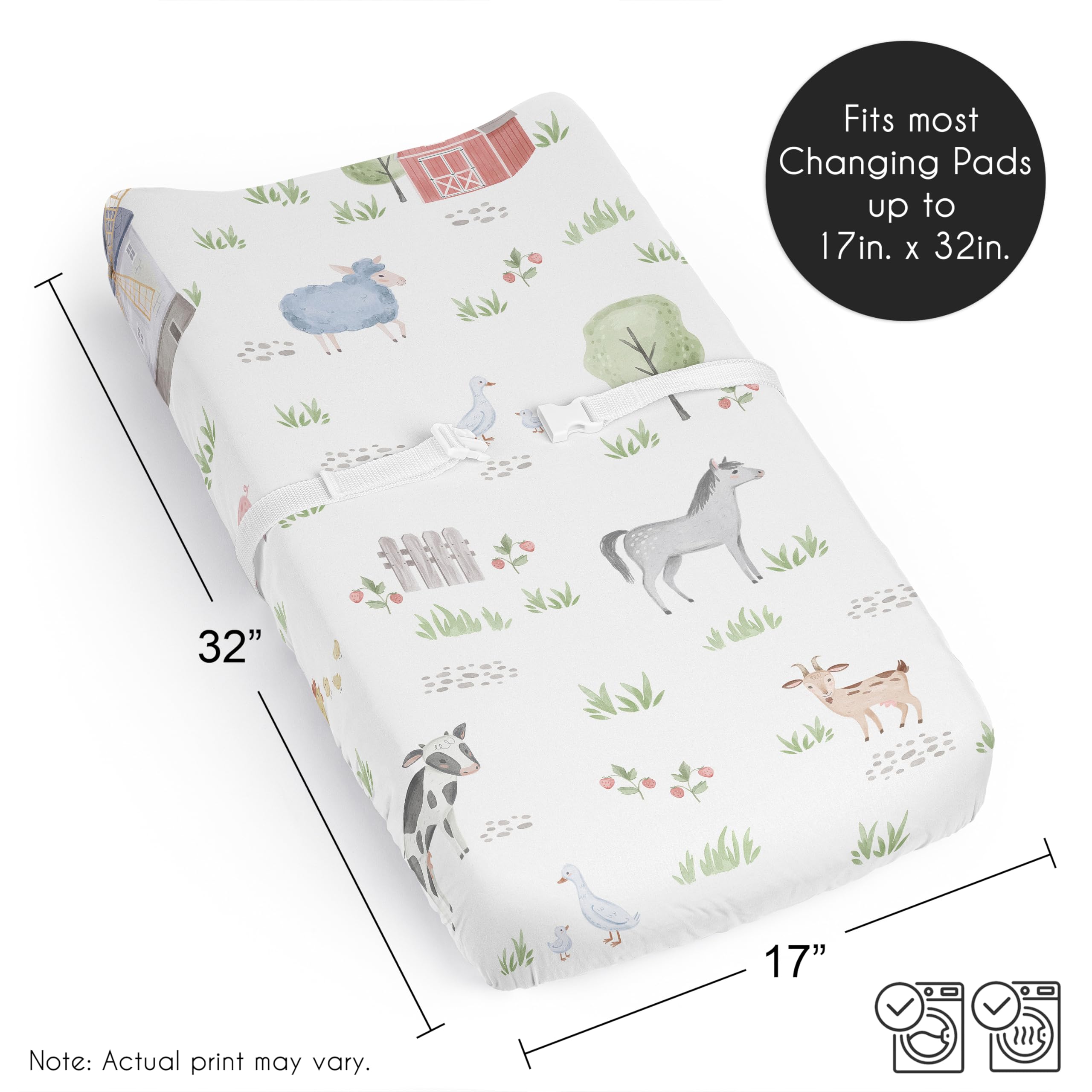 This brushed microfiber diaper pad cover sheet features an exclusive design of grey, red, green, gray, black and white gender neutral nature trees farmhouse barn, silo, cow, horse, sheep, pig, goat and chickens watercolor farm animals print for the Farm Animals Collection.