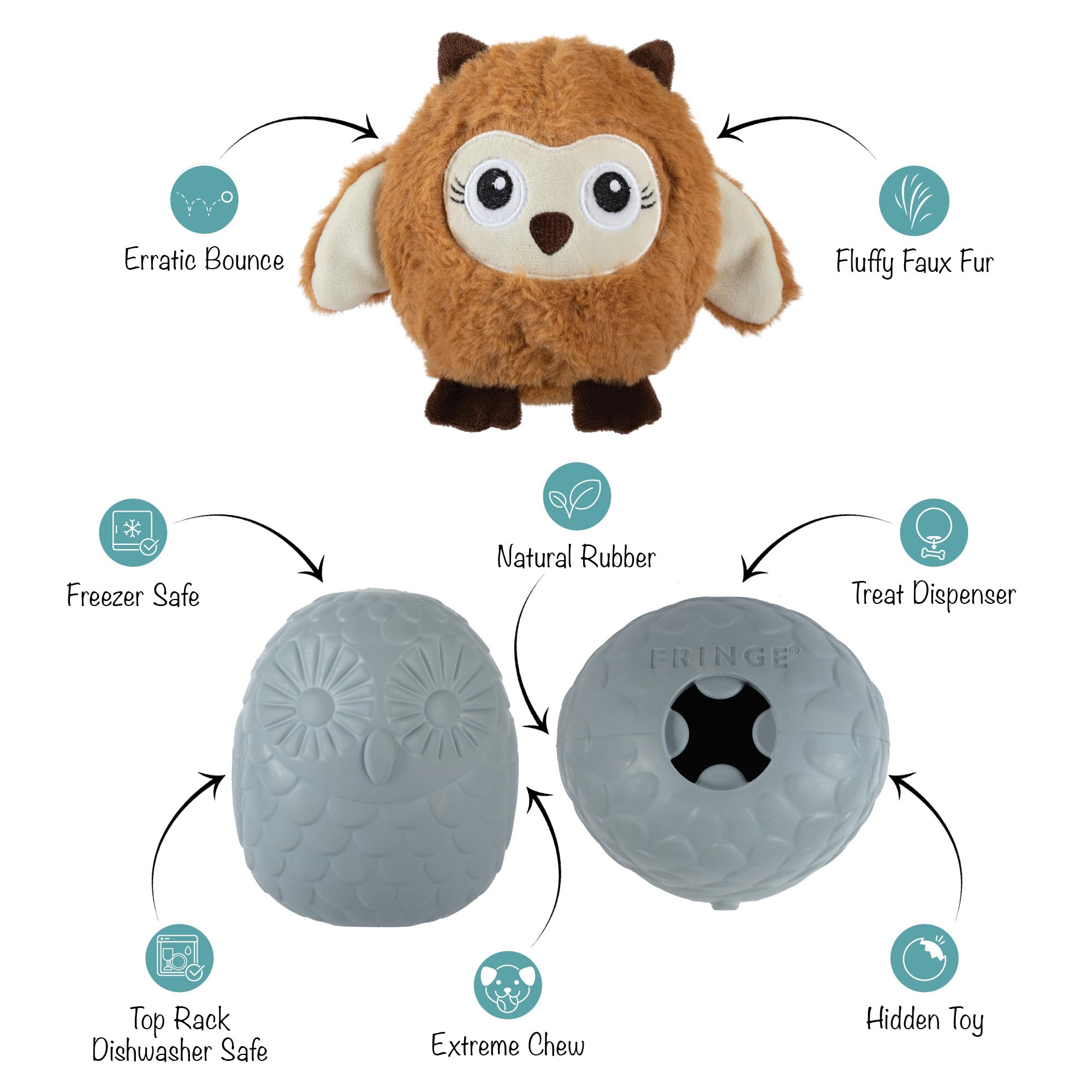 Ready to join the Dura Club? PetShop by Fringe Studio's "Don't Ruffle My Feathers" rubber dog toy is for pups that love to work for their treats, chew, and play lots of fetch. Made with a plush exterior, a hidden natural extreme-chew rubber toy, a treat dispenser, and an erratic bounce, this toy was created for long-lasting interactive play and lots of fetchin' fun. Once your pup chews through the plush, they'll find a rubber owl chew toy with a treat dispenser and raised details that can be used as a lick mat. Simply fill it with treats and toss it for some fetchin' fun to keep your pup busy trying to get them out. What a hoot! Great for all-sized dogs and strong chewers.