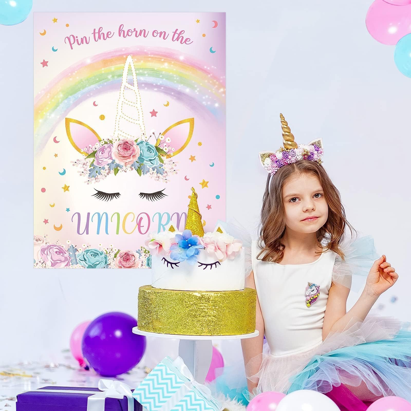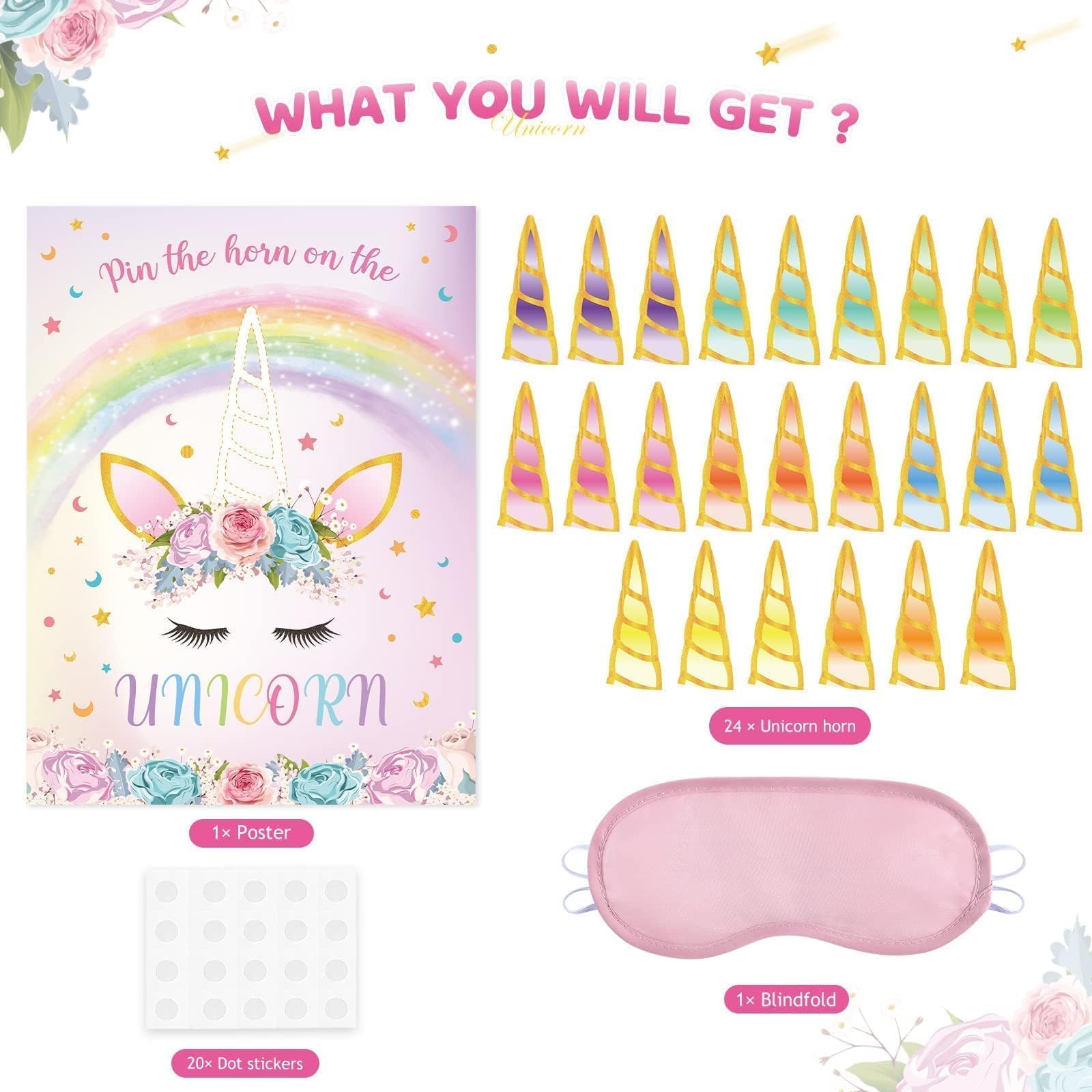 PACKAGE INCLUDES :The birthday party games contains 1*unicorn game poster(28' x 21''), 24*colorful horn stickers,1*blindfold, and 20 *dot stickers, ensuring a fun and complete party game experience.