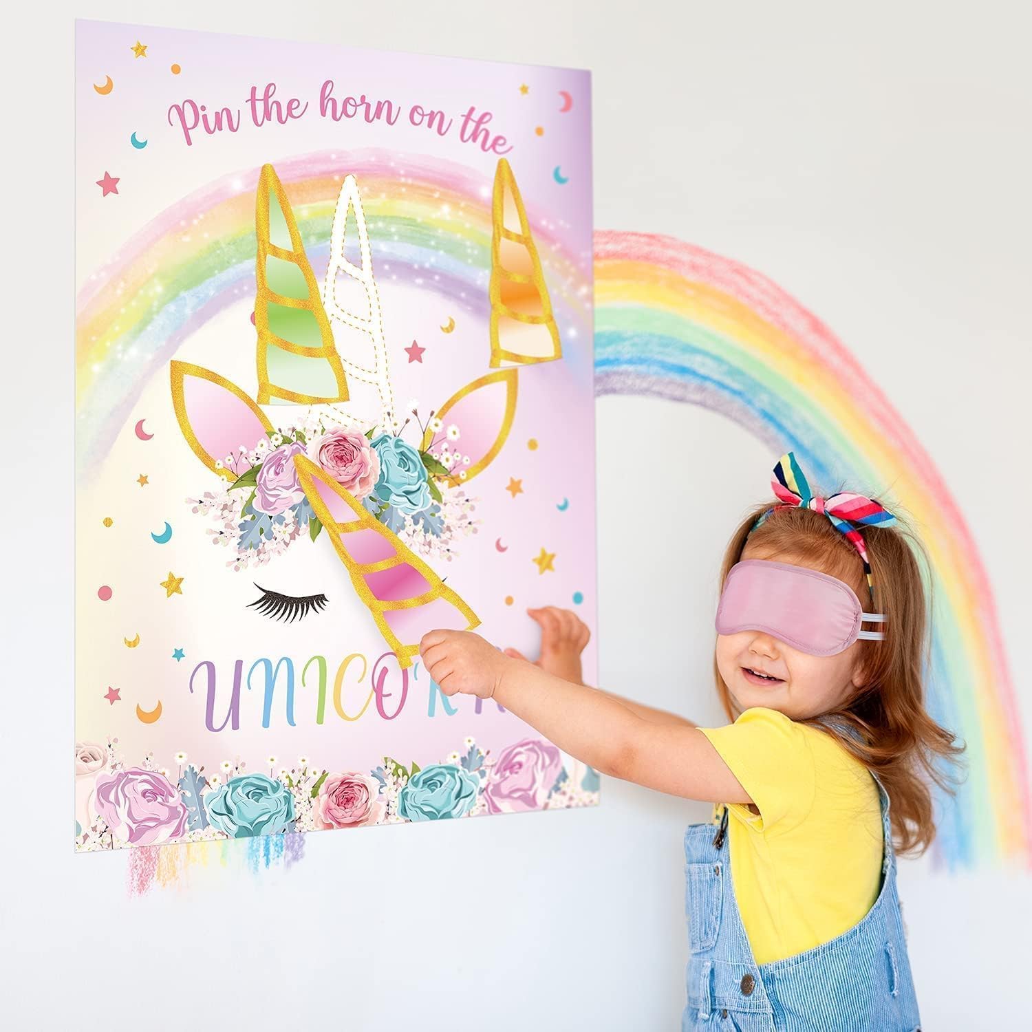 HOW TO PLAY : Attach the poster to the wall with dot stickers. Players take turns wearing the blindfold, choose a horn stickers, and try to pin the horn on the unicorn. The player who places their horn stickers closest to the target wins.