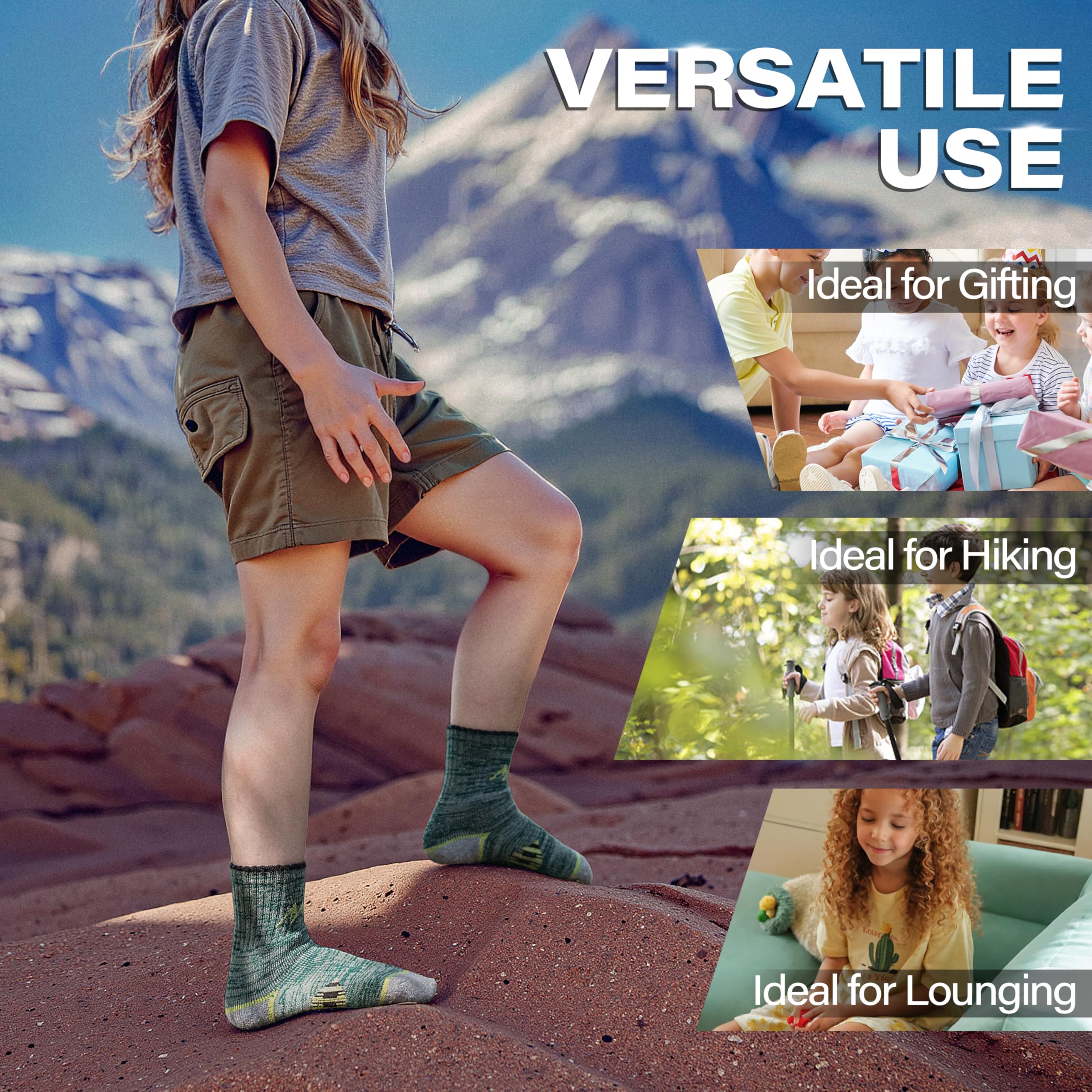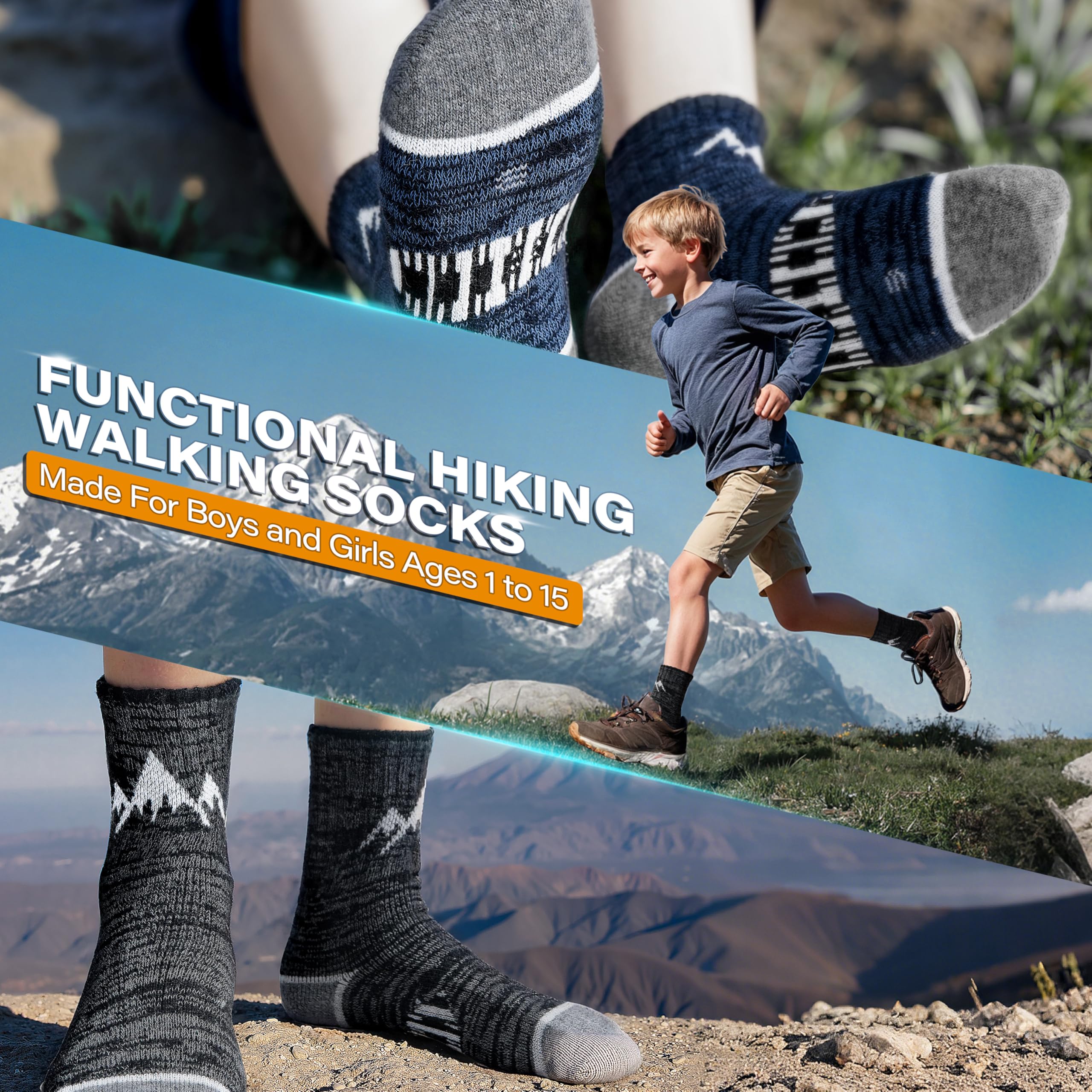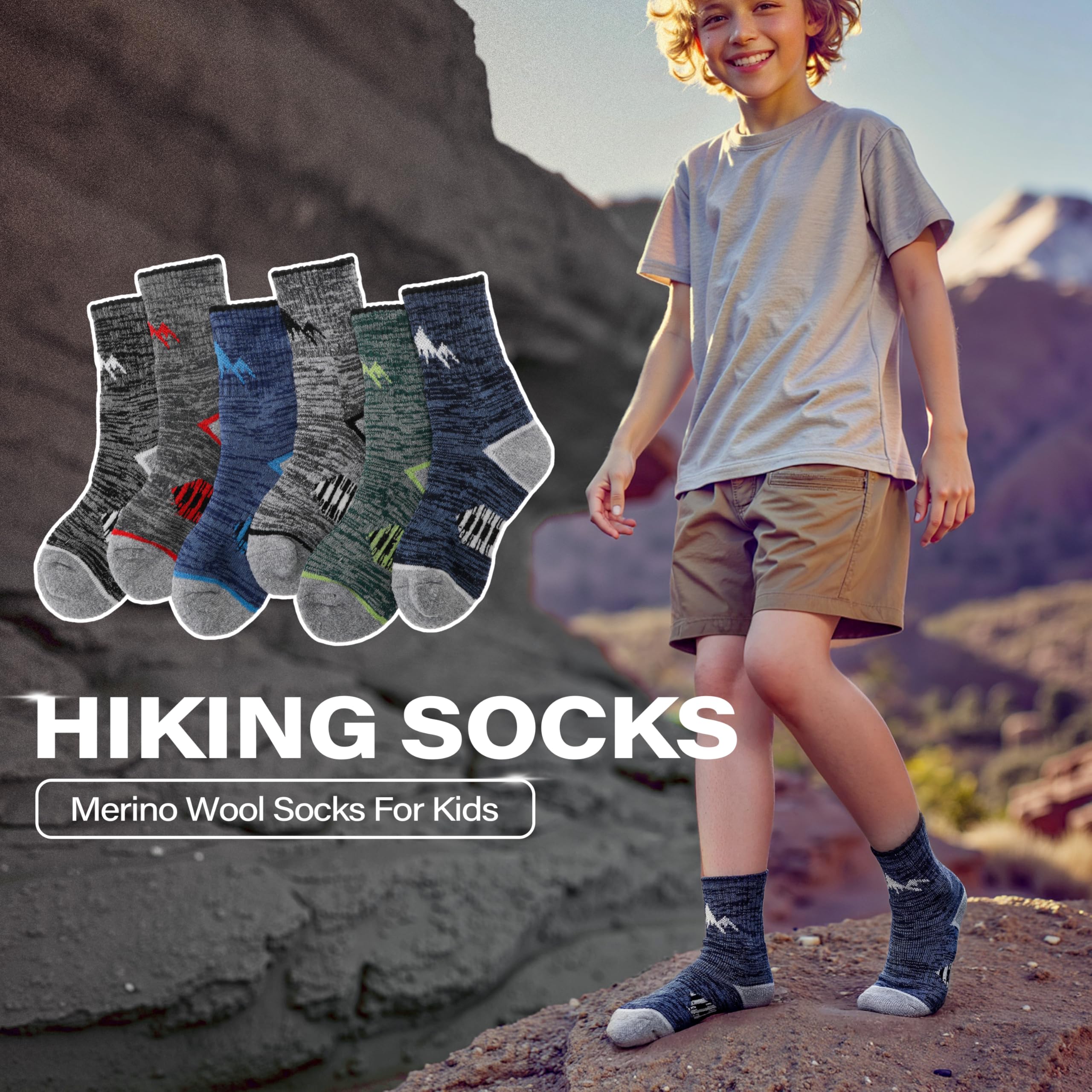 PACKAGE & SIZE: The package includes 6 pairs of merino wool hiking athletic socks for kids. We offer 4 size options: 1-3T, 4-7 Years, 8-12 Years, and 12-15 Years. (REMINDER: Pilling and wool on socks are normal.)