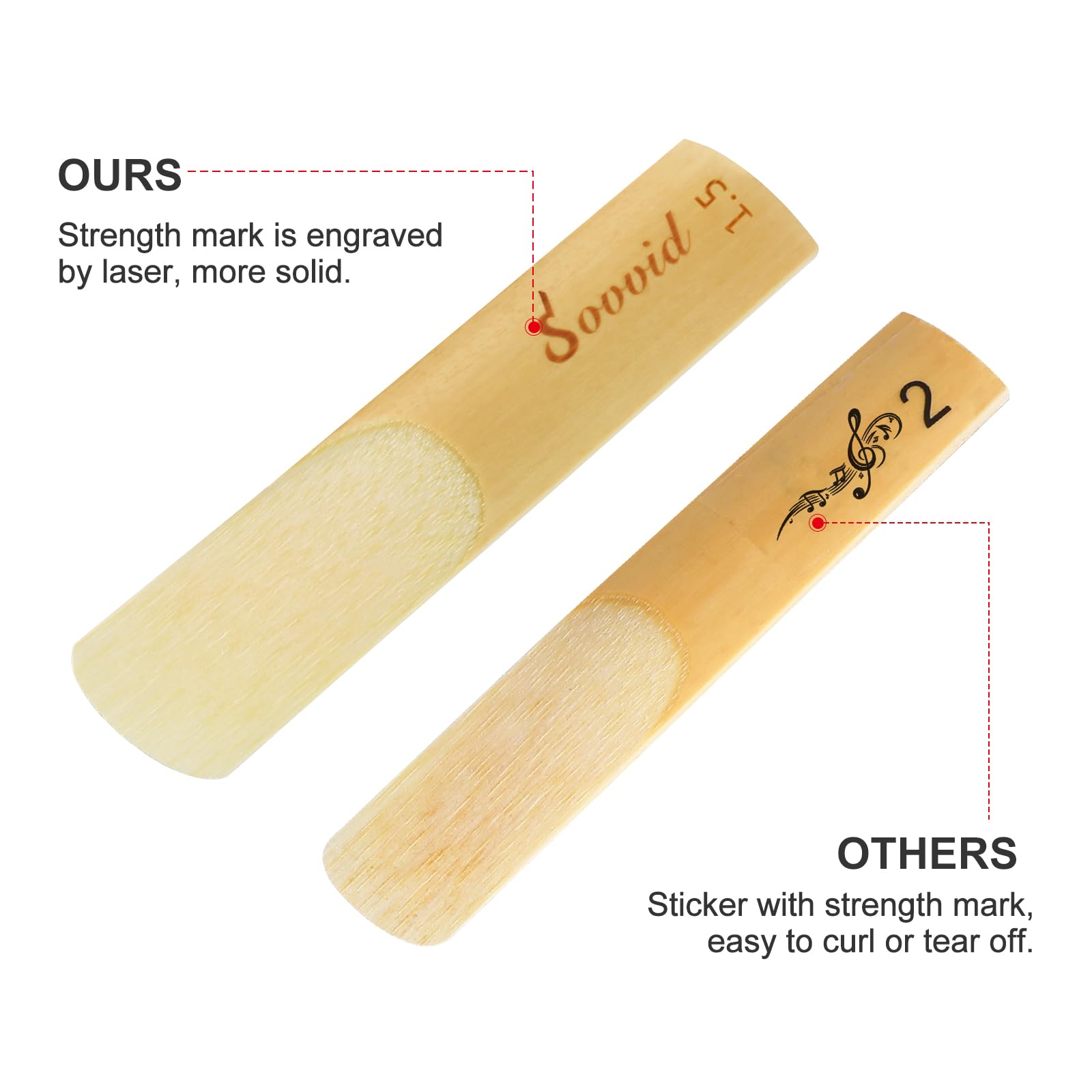 Premium Material Bring Clear Sound: Strength 1.5, box of 10. Sovvid saxophone reeds are made from high quality natural reeds using an advanced process, and have perfect vibrational characteristics, do not deform or break easily and maintain a rich tone