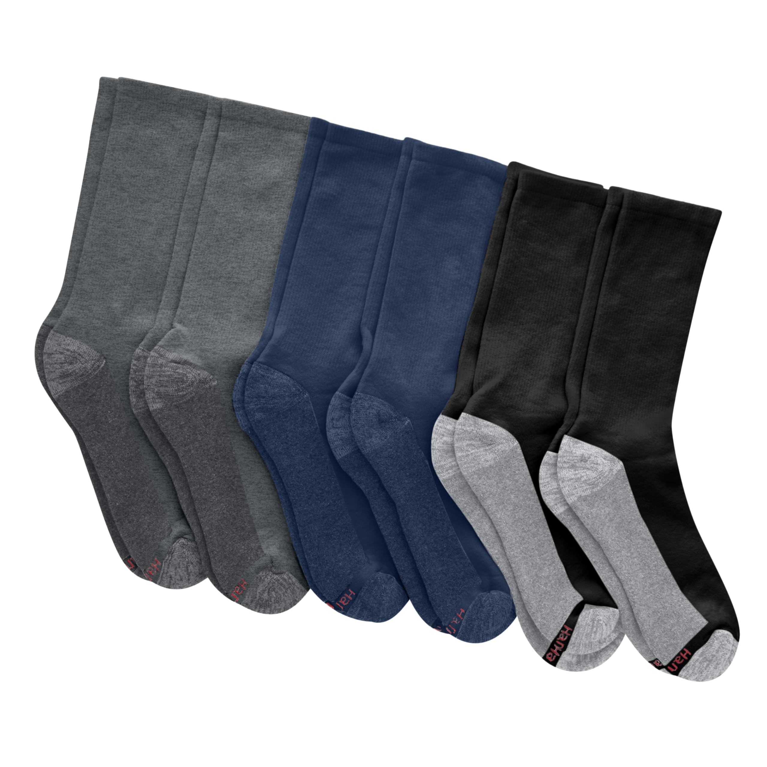Description For sports or everyday wear, you'll appreciate the comfort and construction of Hanes® Max Cushion crew socks. These soft but Double Tough classic crew socks are made to last with a reinforced heel and toe, all the while cradling your foot with extra cushioning you'll feel with every step. These basic crew socks for men are made with Hanes' high-tech features, including Cool Comfort® fabric that wicks away moisture to keep feet cool and dry, and FreshIQ™ advanced odor-fighting technology that attacks odor-causing bacteria to keep feet smelling fresh. Smooth toe seams enhance comfort even more, and a touch of spandex in the fiber blend assures a stay-in-place fit. Stock up on these made-to-last crew socks and fill your sock drawer with comfort.