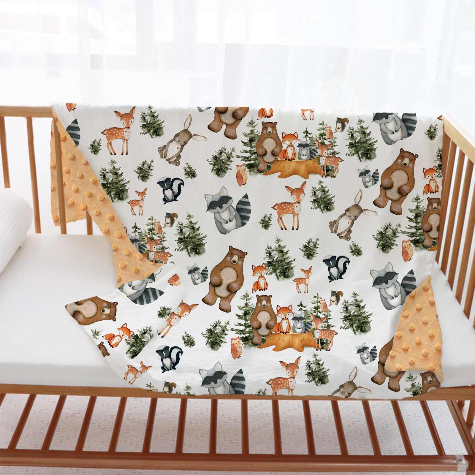Unique Design: Our blankets are all double layered in design, the printed side features a lovely woodland animal pattern and eye-catching, and the other side is three-dimensional polka dots backing, which allows the baby to sleep peacefully and help sleep all night.
