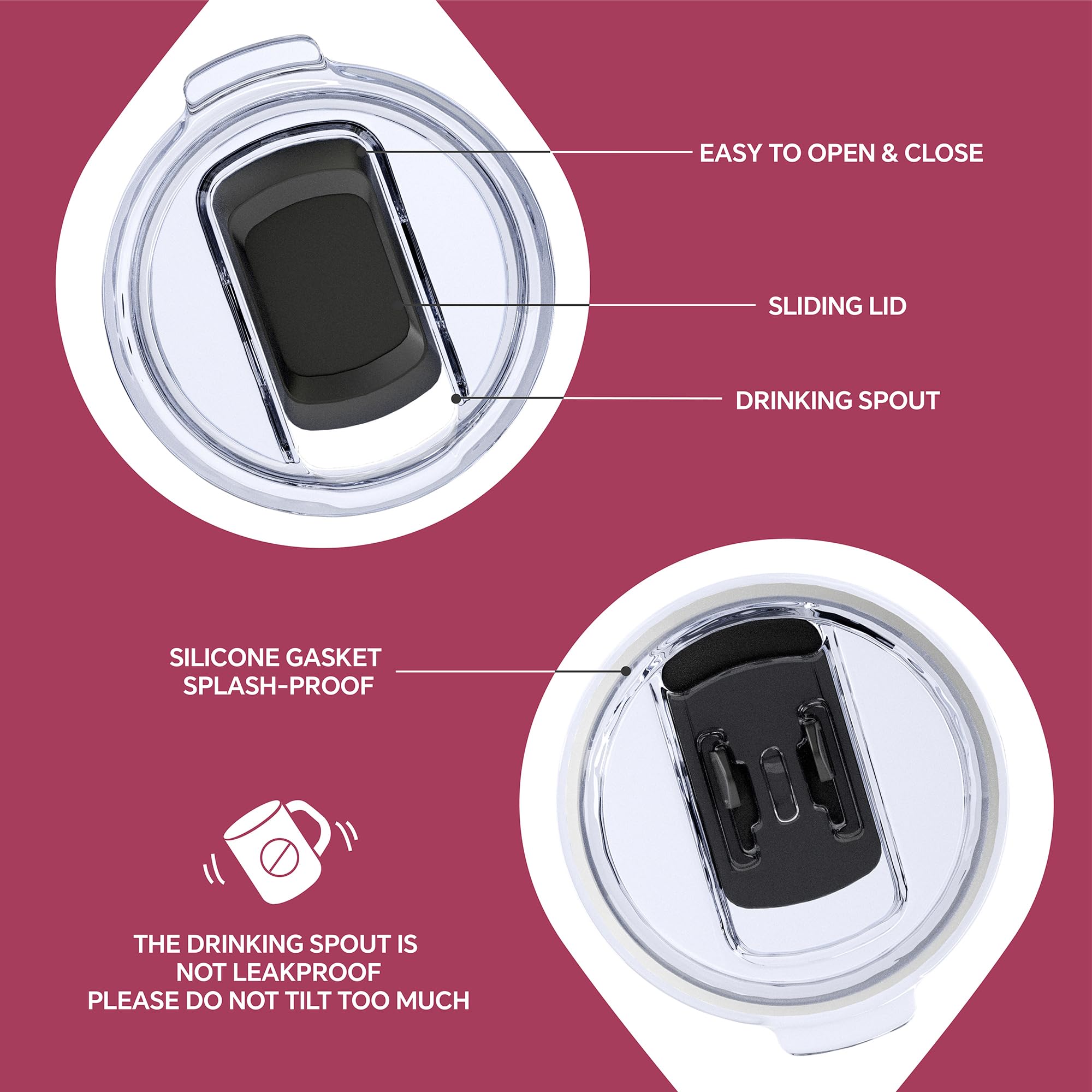 SPILL-PROOF LID - Designed by a professional team of designers, our slider lids facilitate sipping with just a gentle touch. They effectively prevent splashing and spilling; however, it is advisable to avoid turning them upside down as they are not entirely leak-proof.