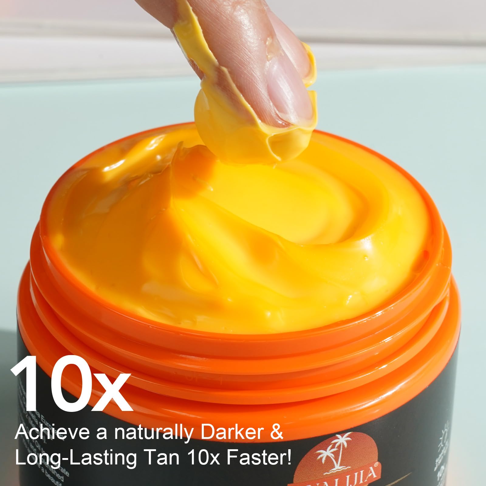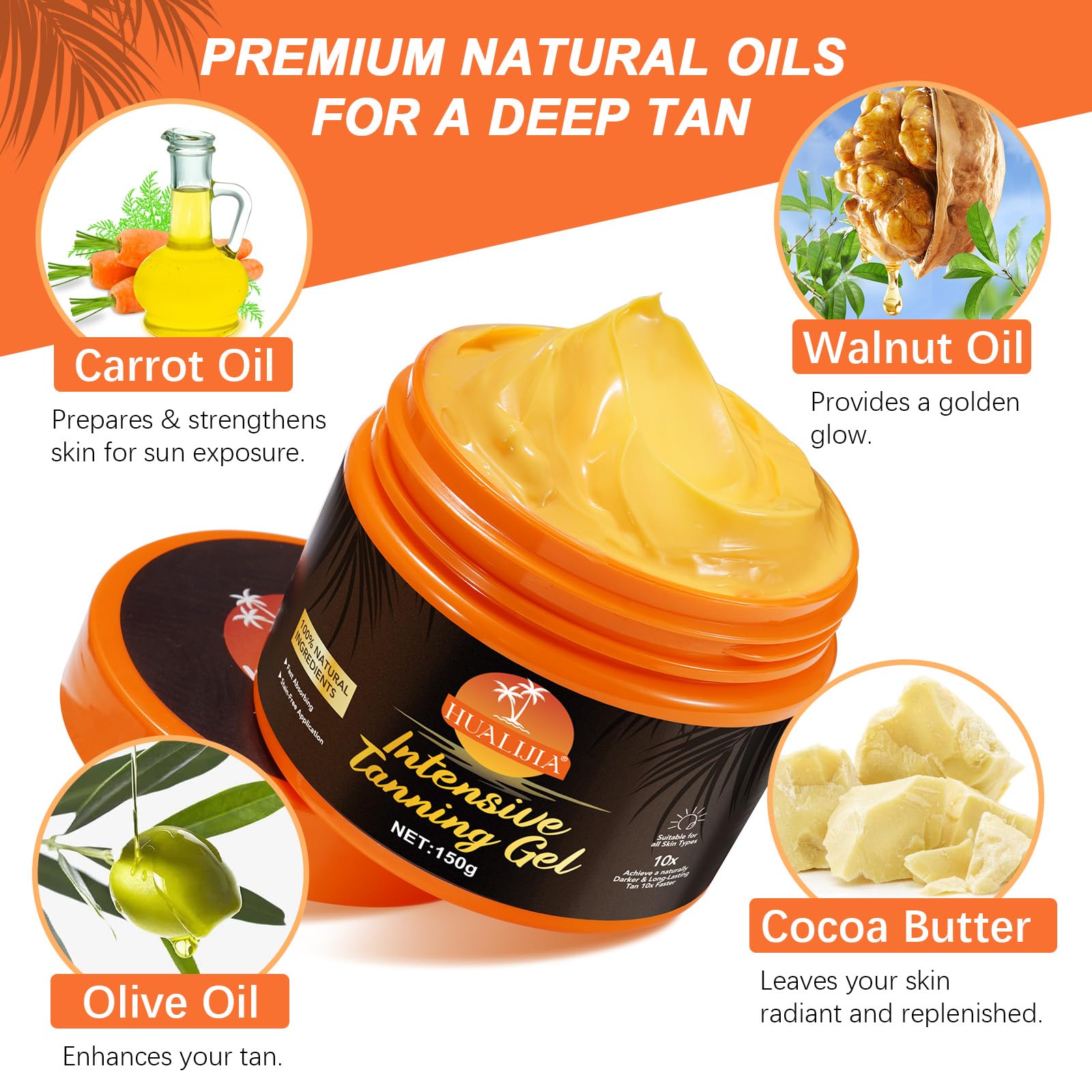 【Fast-Acting Tanning gel with Natural Oils】- Our intensive tanning gel blends carrot oil, walnut oil, and cocoa butter for rapid absorption, accelerating melanin production to deliver a deeper, natural-looking tan with minimal sun exposure. Perfect for all skin types, including sensitive skin
