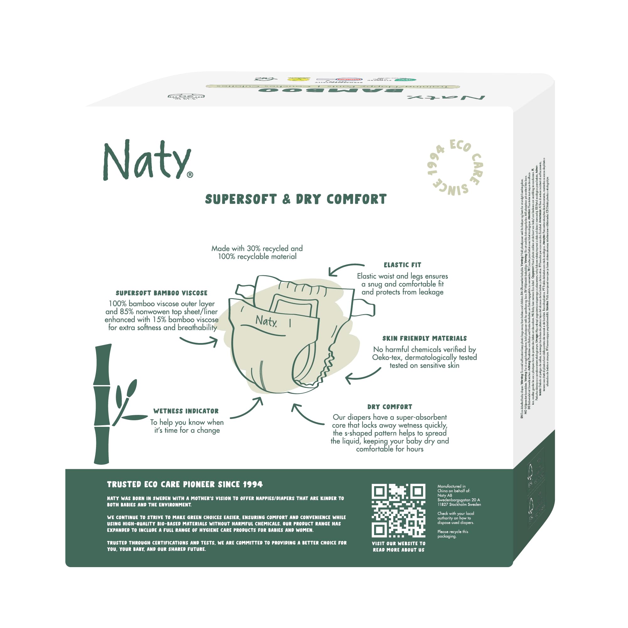 Naty Bamboo Viscose Baby Diapers offer a gentle solution for your babyβs delicate skin. Made with a 100% natural bamboo viscose back sheet and specially developed bamboo viscose enhanced liner, they provide plant-based softness and optimal dry comfort. A convenient wetness indicator helps you know when itβs time for a change. These diapers are designed for superior comfort and absorbency, featuring breathable materials and a multi-layered, advanced core that locks away wetness quickly, keeping your baby dry for hours. With strong leak protection, Naty diapers ensure long-lasting dryness for both day and night use. Perfect for sensitive skin, Naty diapers are hypoallergenic and free from harmful chemicals. They contain no fragrances, lotions, chlorine, latex, dioxins, phthalates, or dyes. They are certified by OEKO-TEX Standard 100 and dermatologically tested by Dermatest with an "Excellent" rating. The flexible, stretchy fit ensures comfort as your baby grows. Elastic waist and leg cuffs offer a snug, comfortable fit. Available in sizes 1-7 for diapers and sizes 3-7 for pull-up pants, they adapt as your baby transitions from newborn to toddler.