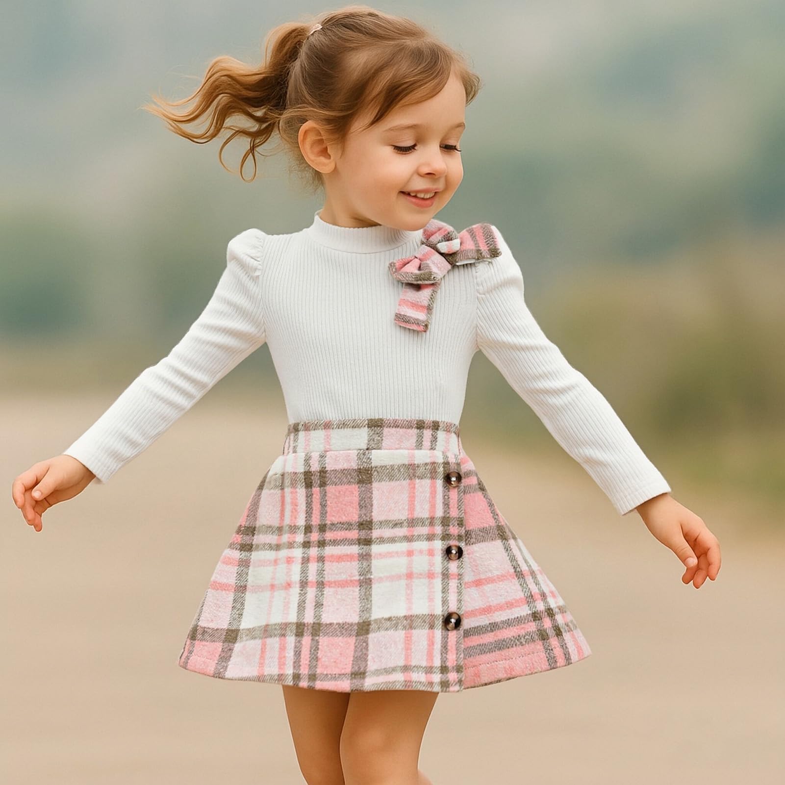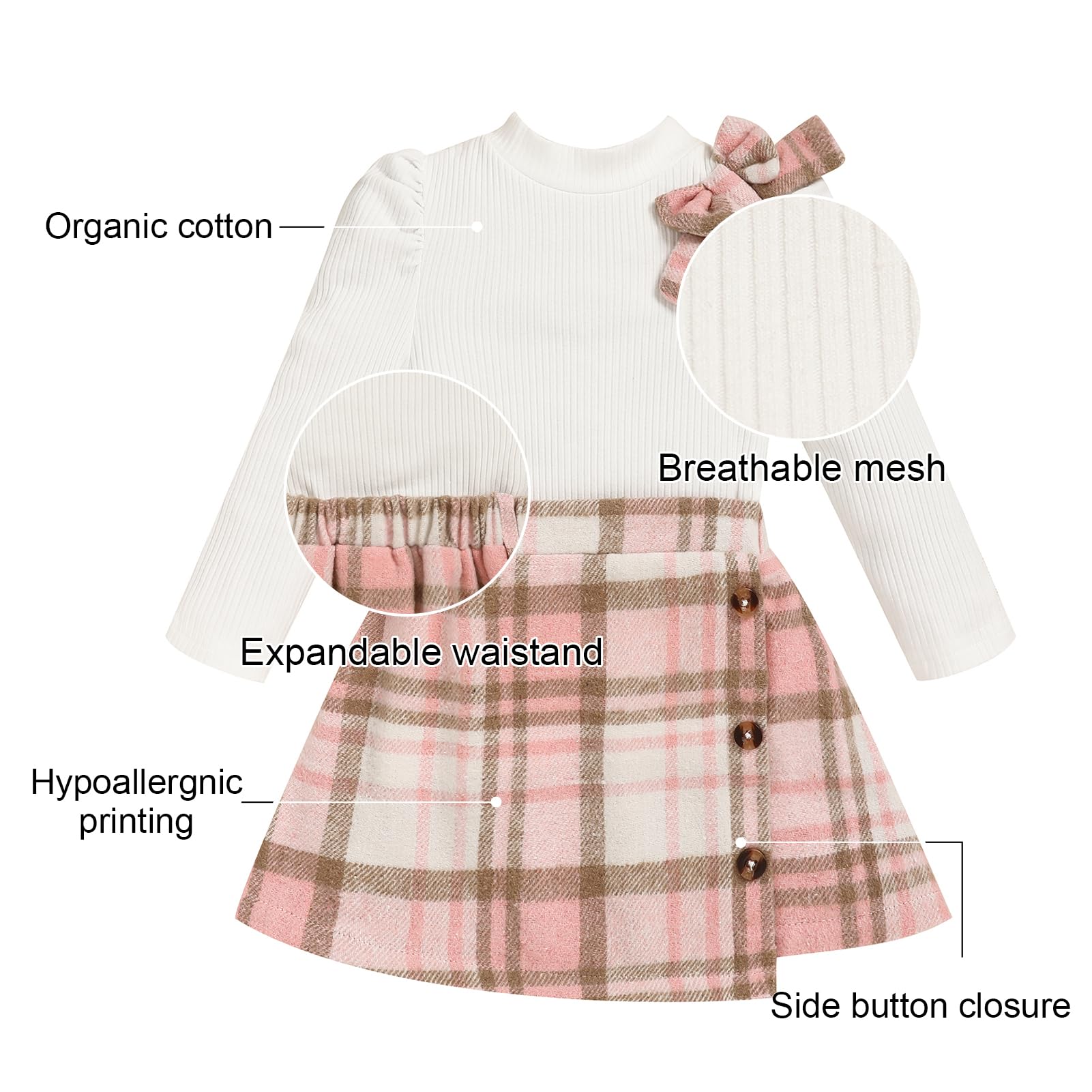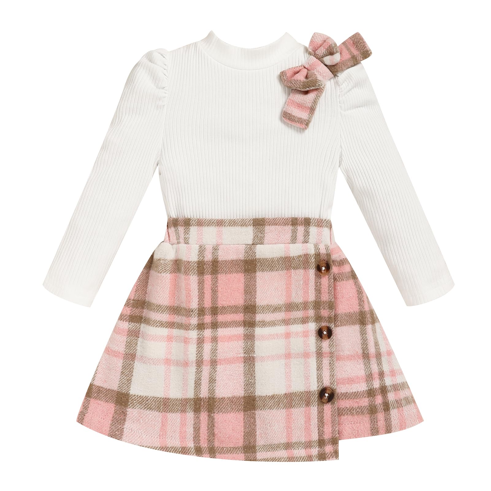 MATERIAL: Toddler girl shirt sweater top is made of cotton and polyester, bottom skirt is made of cotton blend and polyester, soft, breathble, and comfortable, sweet toddler baby girl 2 piece skirt set, cute baby girl clothes.