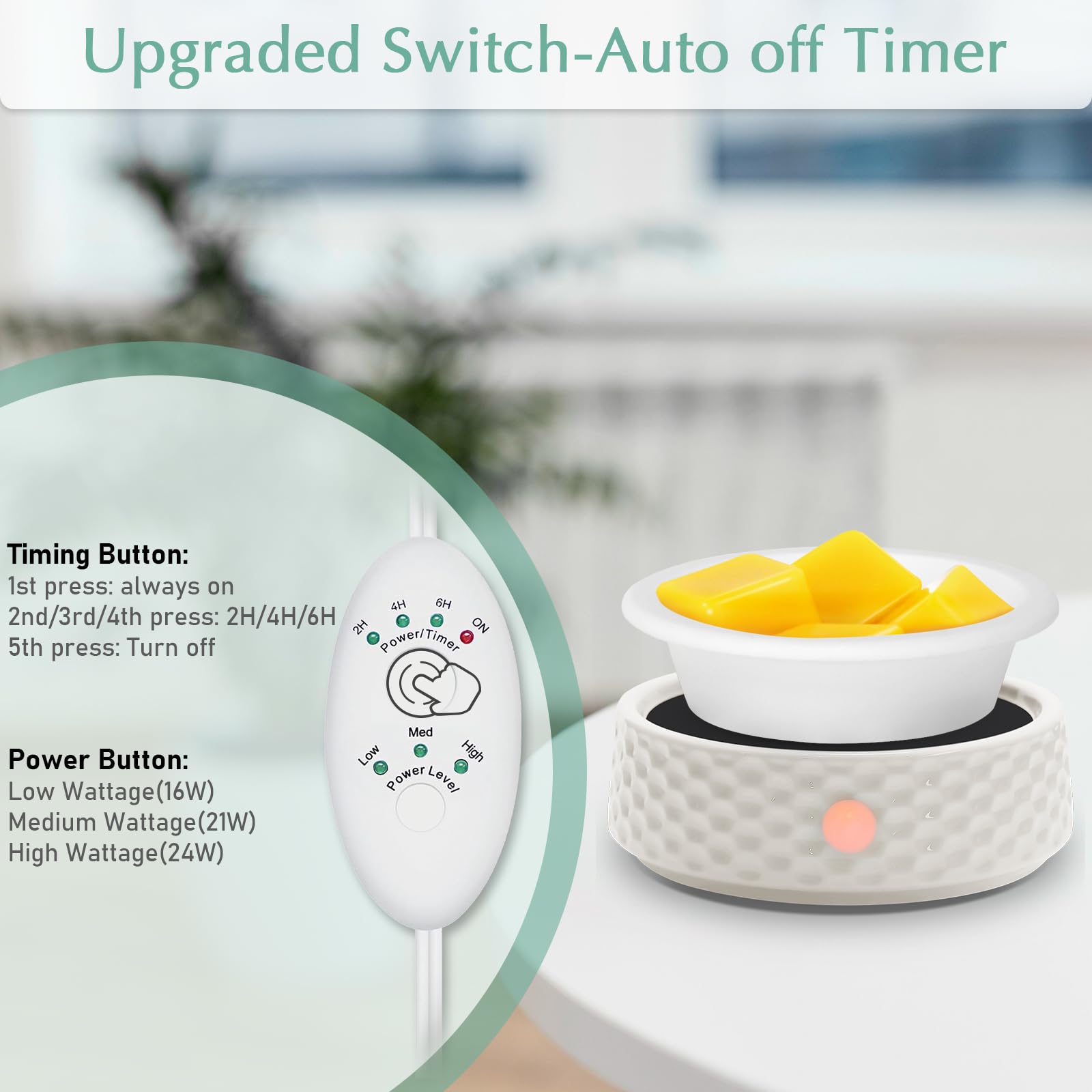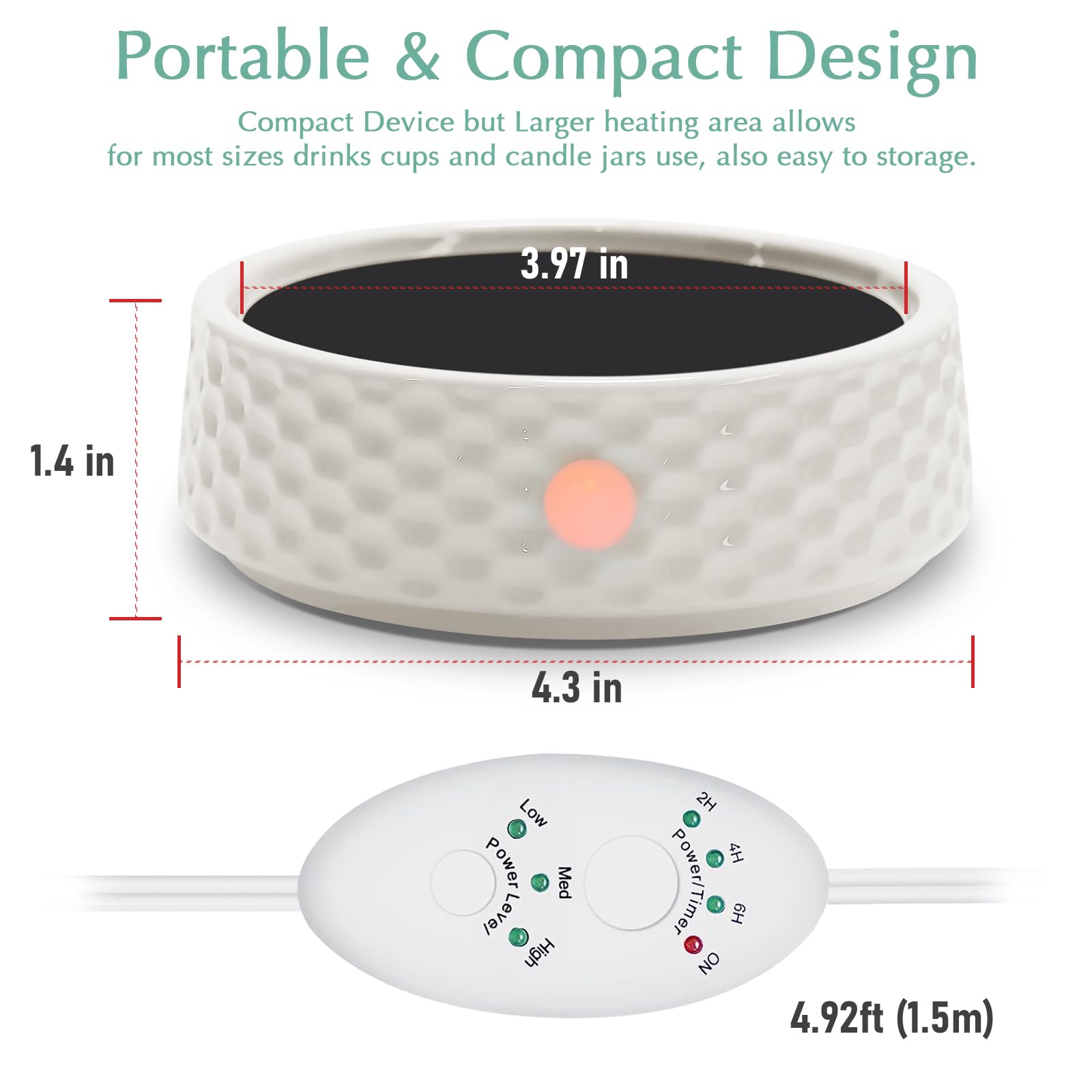 Timer and power level adjustment Function: Our candle warmer has upgraded two functions: timer function and power level adjustment function. Therefore, you can set your candle warmer to automatically turn off after 2, 4, or 6 hours, or you can set this warmer plate to always turn on. Our ceramic candle wax warmer also has the function of adjustable power level, with low(16W)/medium(21W)/high(24W) power to meet your different candle jar/coffee mug heating needs.
