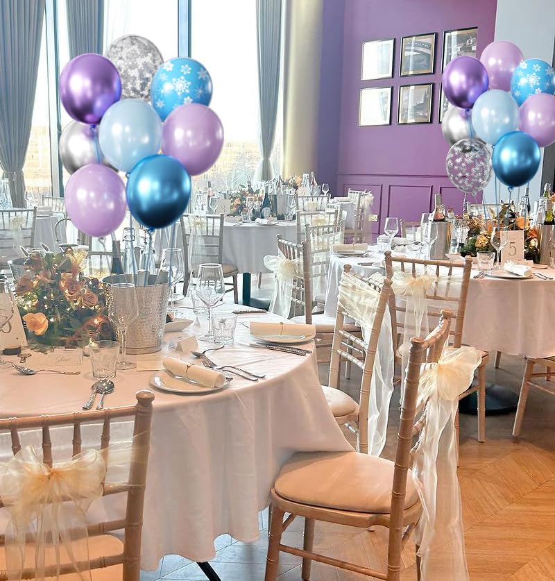 γAll-in-One Kitγ: This purple blue white and silver balloons kit includes everything you need to create a stunning decoration, metallic chrome silver balloons 5pcs, metallic chrome blue balloons 7pcs, metallic chrome purple balloons 7pcs, silver snow confetti balloons 5pcs, snow blue print balloons 6pcs, pearl blue balloons 10pcs, pearl purple balloons 10pcs, 2pcs silver blue balloon ribbons 32ft. The size of the balloon is about 12 inches after inflation. the synergy of purple blue silver balloon balloons can make any party or occasion more elegant.