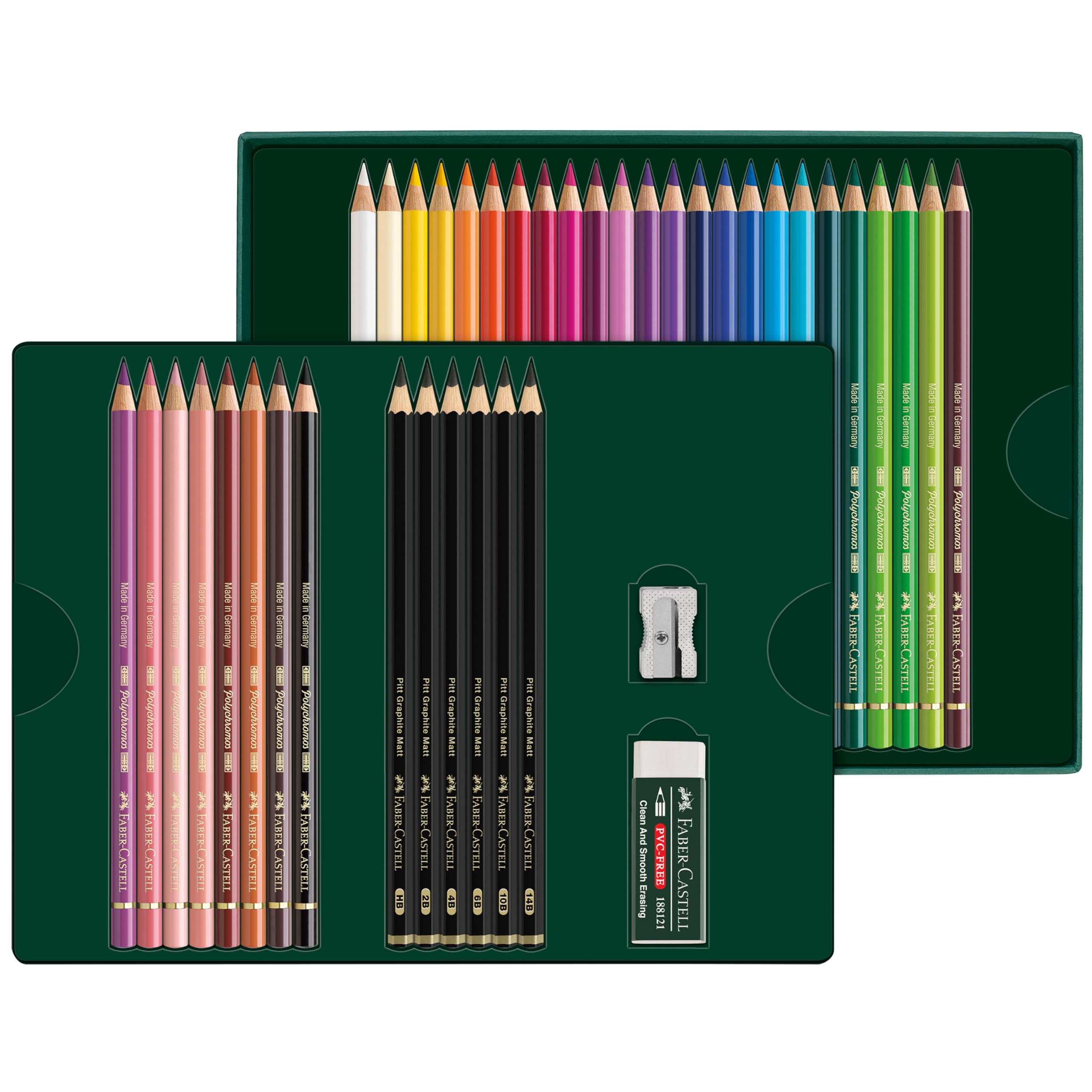 Faber-Castell Polychromos Colored Pencils offer supreme artist-quality vibrancy and reliability to bring your art to life. These quality colored pencils are infused with premium, acid-free pigments, ensuring exceptional lightfast qualities. Buttery smooth and blendable, the rich, permanent colors are water-resistant and smudge-proof and will not give a waxy bloom to artwork. Polychromos Colored Pencils feature thick, 3.8mm break-resistant leads. Housed in premium cedar wood, the round colored pencils are pre-sharpened for endless art creation. Experience graphite without the glare! An exciting innovation in artist materials, Faber-Castell presents the extremely matte graphite pencil of supreme artists' quality - The Pitt Graphite Matte Pencil. Unlike other graphite pencils that create a shiny luster when applied heavily, these sketching pencils offer an ultra-matte graphite laydown for reduced reflection on paper. They have the highest tonal value density for maximum depth effects. With a smooth graphite laydown, they are ideal for writing, drawing, and sketching. Bring your creativity from pencil to paper with Pitt Graphite Matte Pencils, the perfect companion for monochrome graphite work. Since 1761, Faber-Castell has created superior-quality tools for creatives to write, sketch, draw, and color. Artists of all skill levels can experience endless creativity with this high-quality artist supplies gift set featuring Polychromos Colored Pencils and Pitt Graphite Matte pencils. Complete contents of this gift set include: 32 Polychromos Color Pencils #101 White, #107 Cadmium Yellow, #111 Cadmium Orange, #112 Leaf Green, #131 Coral, #133 Magenta, #119 Light Magenta, #145 Light Phthalo Blue, #144 Cobalt Blue Greenish, #159 Hooker's Green, #160 Manganese Violet, #177 Walnut Brown, #187 Burnt Ochre, #192 India Red, #199 Black, #219 Deep Scarlet Red, #103 Ivory, #108 Dark Cadmium Yellow, #115 Dark Cadmium Orange, #142 Madder, #123 Fuchsia, #135 Light Red-Violet, #138 Violet, #143 Cobalt Blue, #154 Light Cobalt Turquoise, #158 Deep Cobalt Green, #132 Beige Red, #170 May Green, #189 Cinnamon, #166 Grass Green, #247 Indanthrene Blue and #263 Caput Mortuum Violet, 6 Pitt Matte Graphite Pencils HB, 2B, 4B, 6B, 10B and 14B, 1 Dust-free vinyl eraser and 1 Single hole metal Sharpener in a gift box